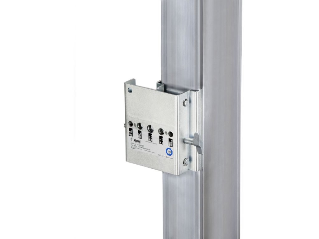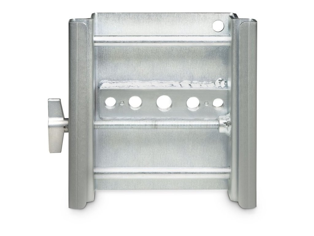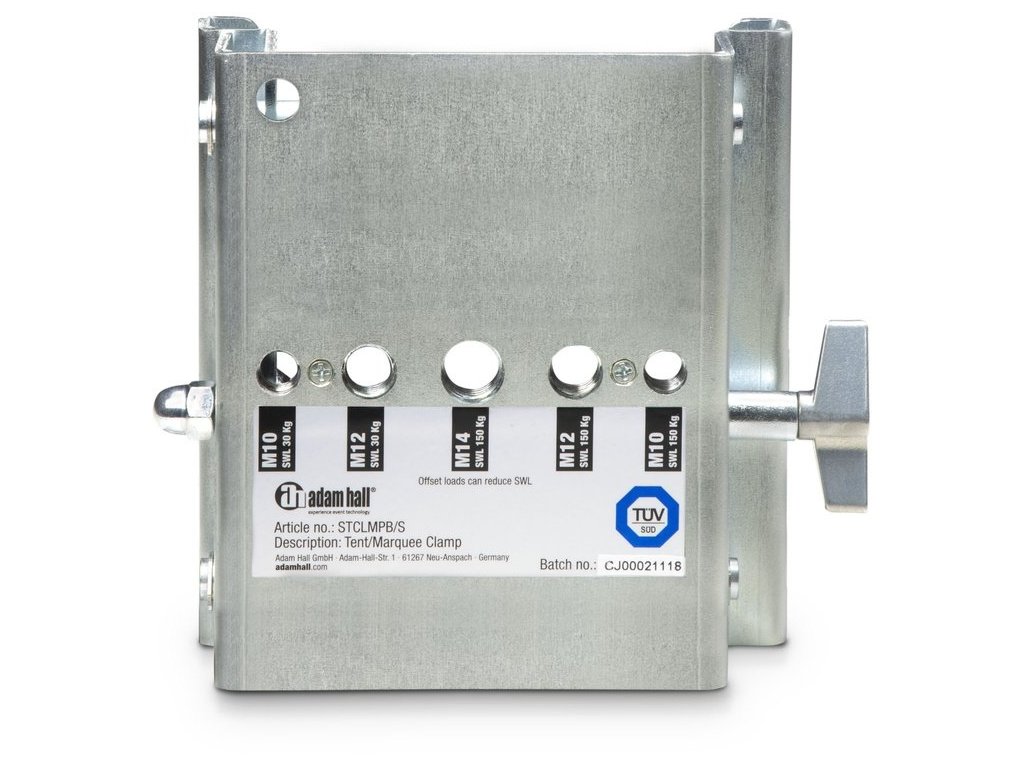 Za pomocą tego regulowanego zacisku do rusztowań można łatwo tworzyć punkty zawieszenia dla urządzeń audio i oświetleniowych. Nadaje się do belek o szerokości od 50 do 100 mm i udźwigu do 150 kg. Zacisk jest wyposażony w pięć wbudowanych punktów mocowania dla śrub z oczkiem i innego osprzętu mocującego.