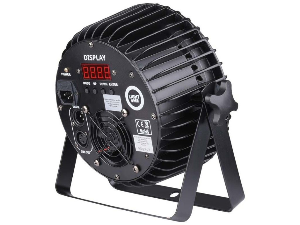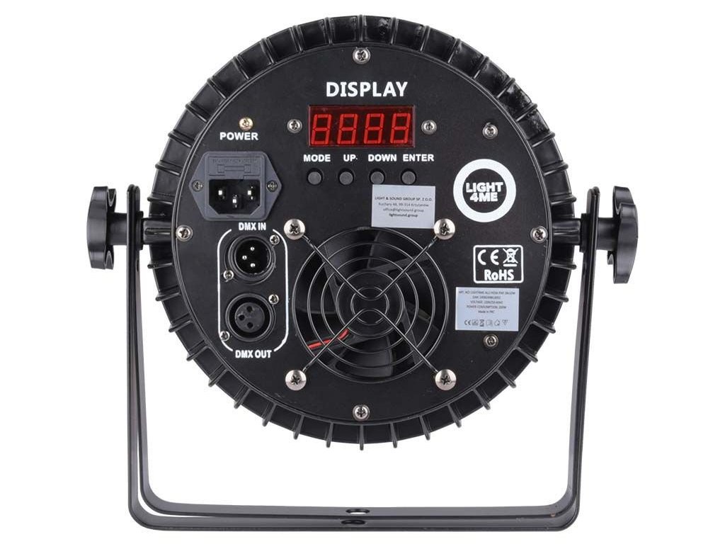 Light4Me Alu Quad PAR 18x6W jest wysokiej jakości, a wszystkie komponenty są zamknięte w solidnej aluminiowej obudowie. Światło jest wyposażone w uchwyty montażowe, dzięki którym LED PAR może pracować w pozycji stojącej lub zawieszonej. Z tyłu znajduje się złącze zasilania, 3-pinowe wejście i wyjście DMX oraz panel sterowania składający się z cyfrowego wyświetlacza i 4 przycisków. Za ich pomocą możemy poruszać się i zmieniać parametry menu, ręcznie ustawić kolor statycznego oświetlenia lub wybrać jeden z 4 trybów pracy: