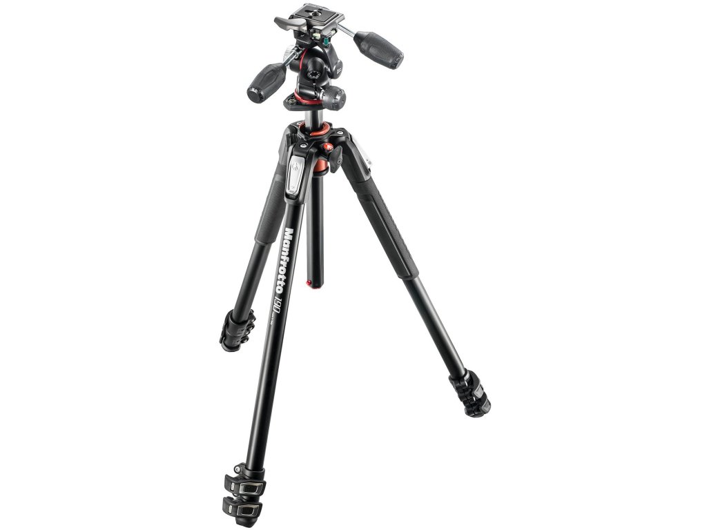 Trzyczęściowy aluminiowy statyw Manfrotto w zestawie z trójkierunkową głowicą.