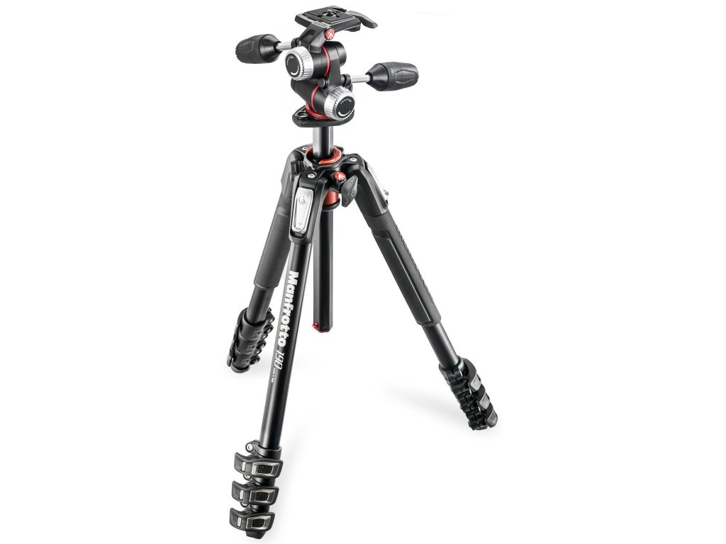 Czteroczęściowy aluminiowy statyw Manfrotto w zestawie z trójkierunkową głowicą.