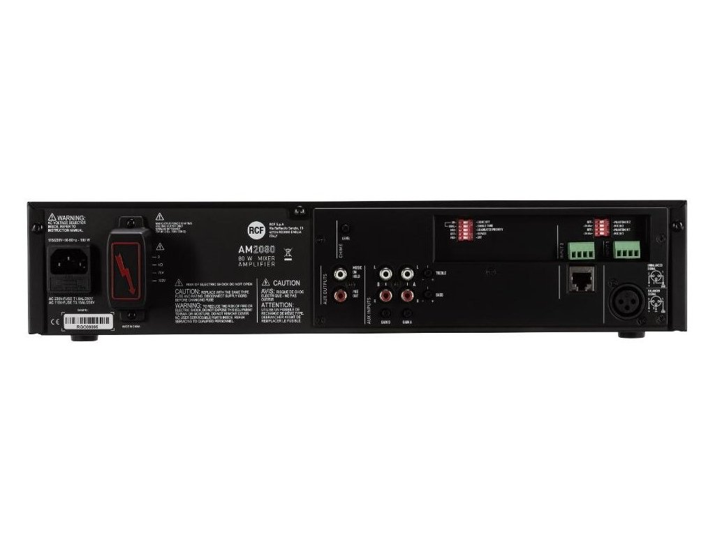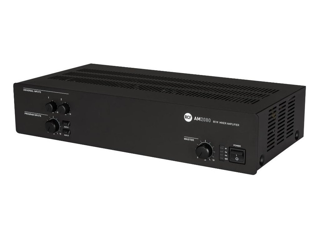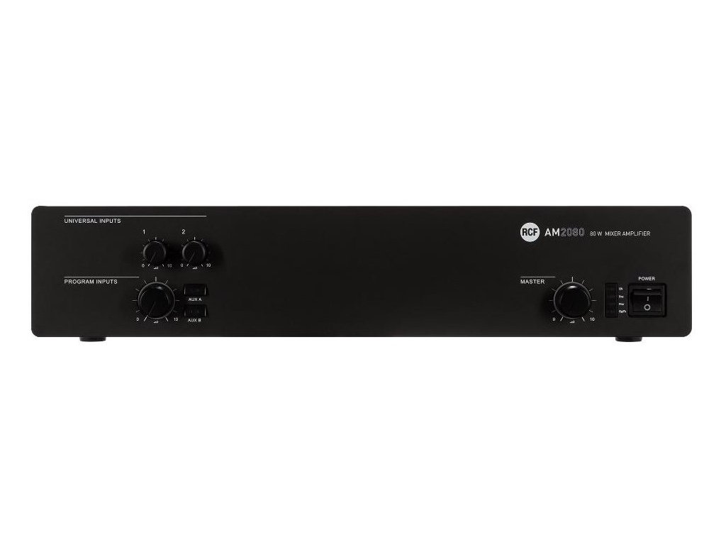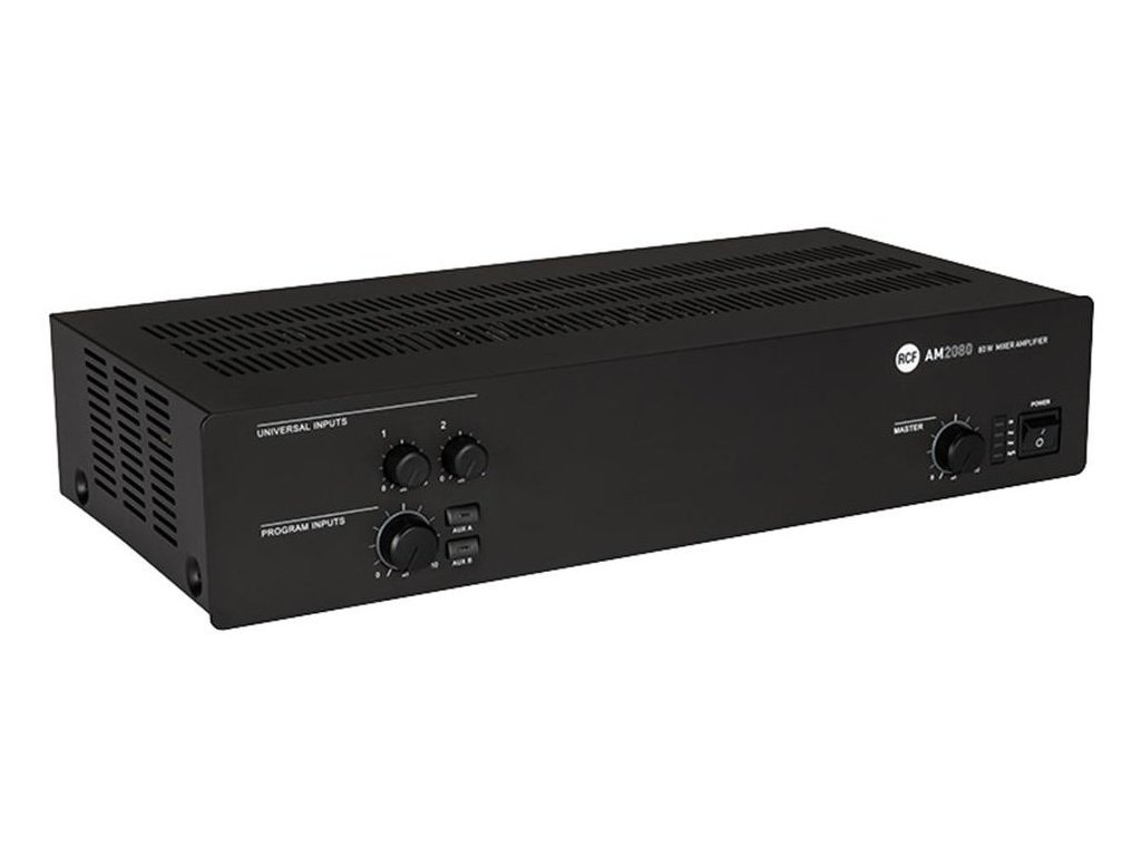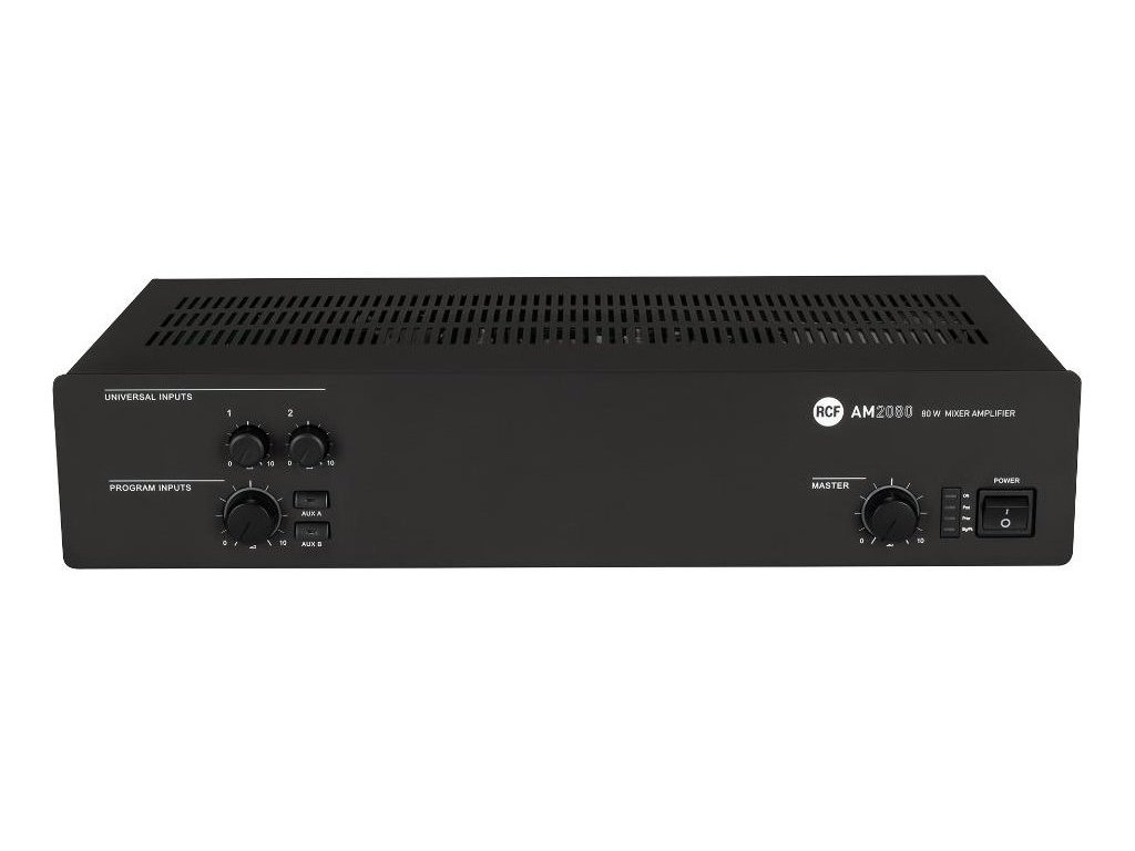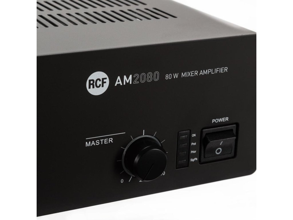 AM 2080 to wzmacniacz miksujący z 2 mikrofonowymi wejściami liniowymi audio na odłączanych złączach (pierwsze wejście ma również gniazdo XLR) i 2 wejściami aux dla źródeł muzyki (np. odtwarzacze CD, tunery itp.). Moc znamionowa: to wzmacniacz 80 W. Wyjście wzmacniacza jest dostępne albo dla głośników o niskiej impedancji, albo dla linii ze stałym napięciem 100 - 70 V.