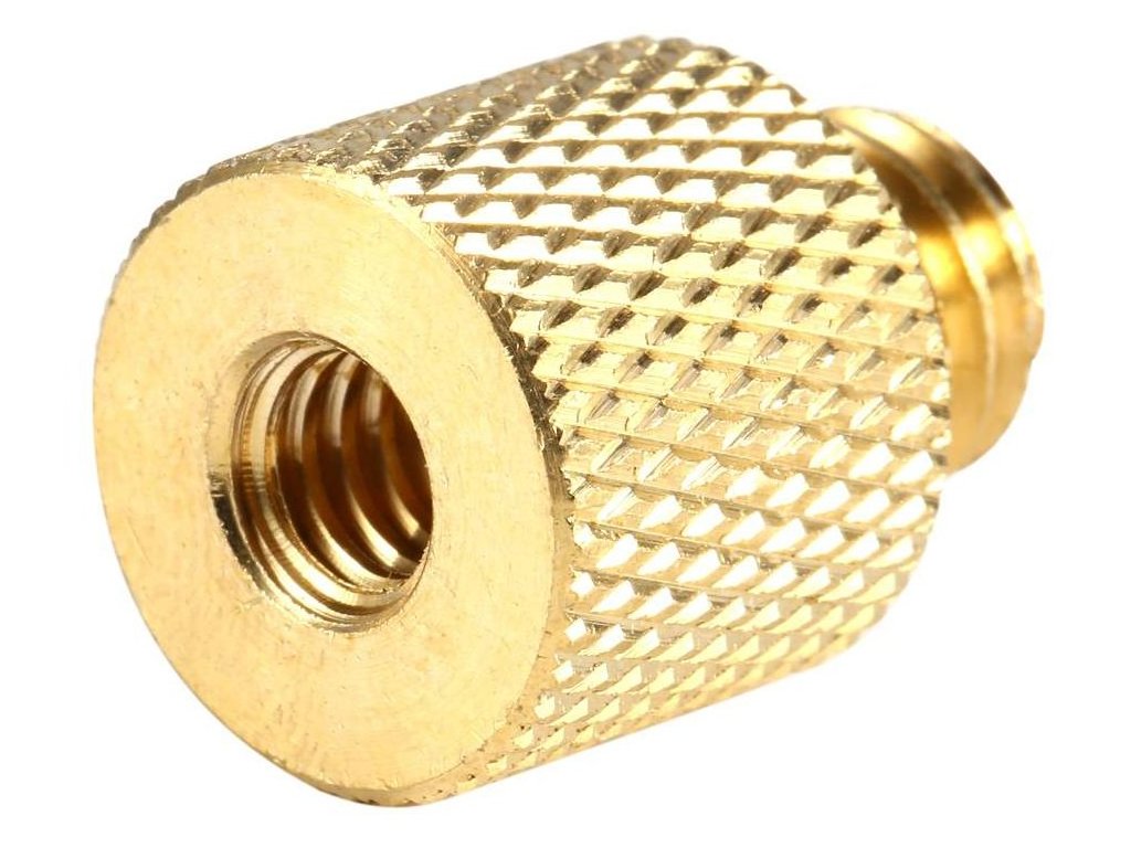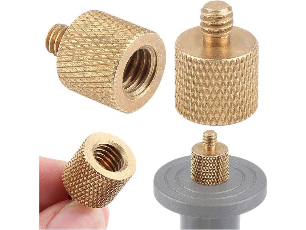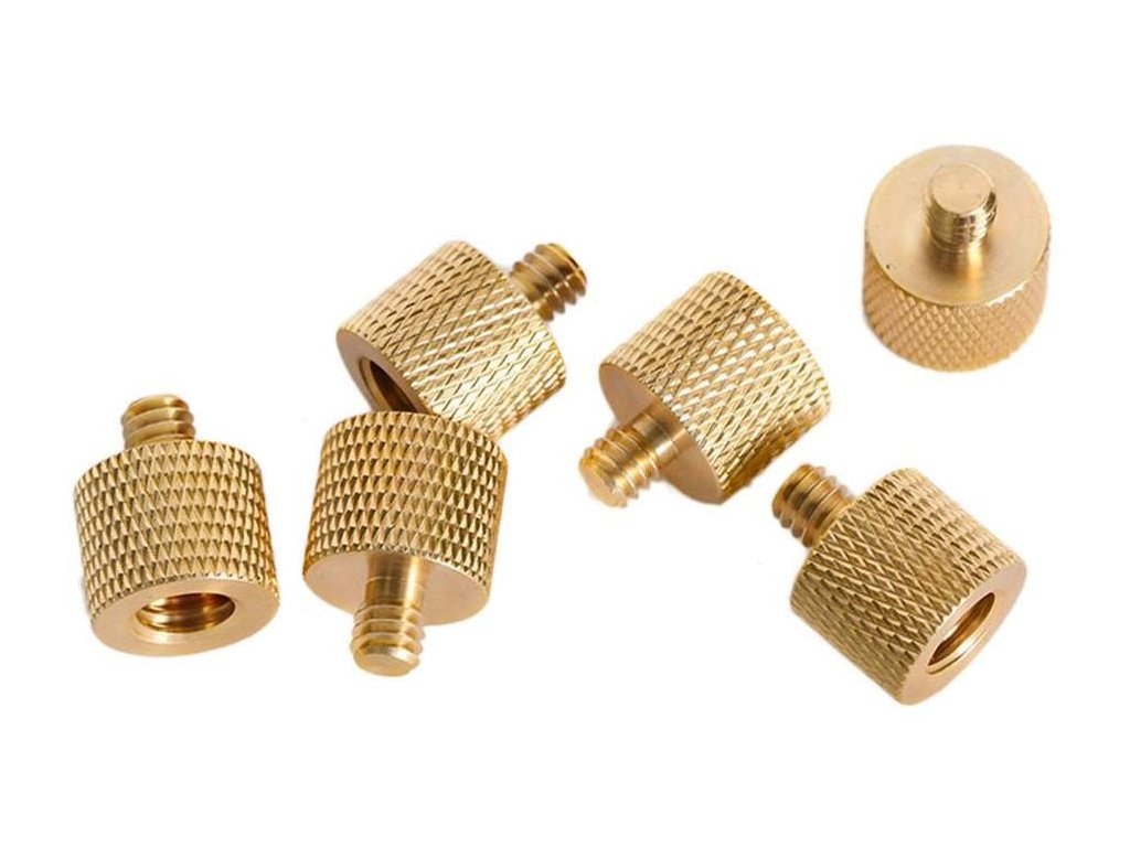 Miedziana, pozłacana redukcja gwintowa z 3/8” na 1/4” odpowiednia do mocowania aparatów fotograficznych, kamer, kieszonkowych rejestratorów lub dodatkowych uchwytów do statywów mikrofonowych i studyjnych.