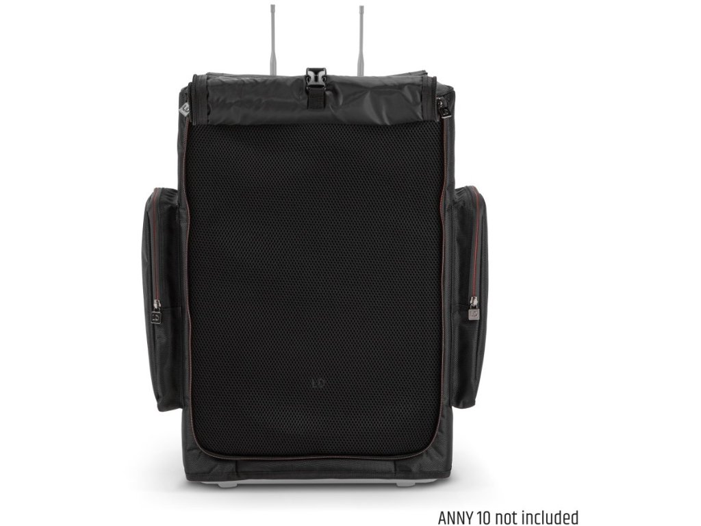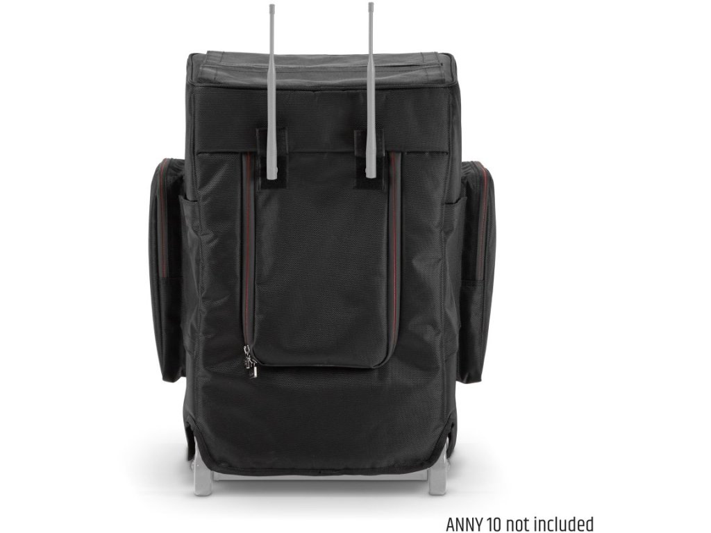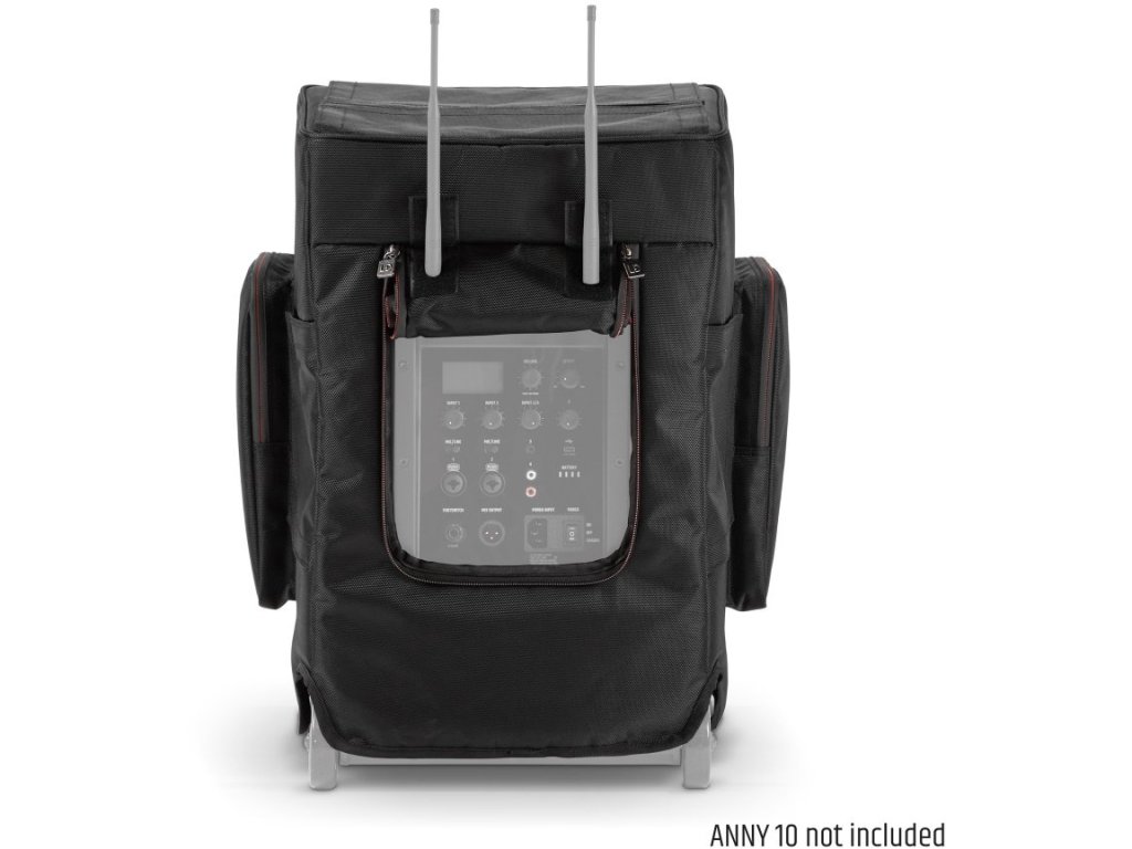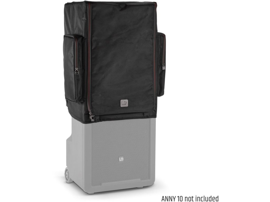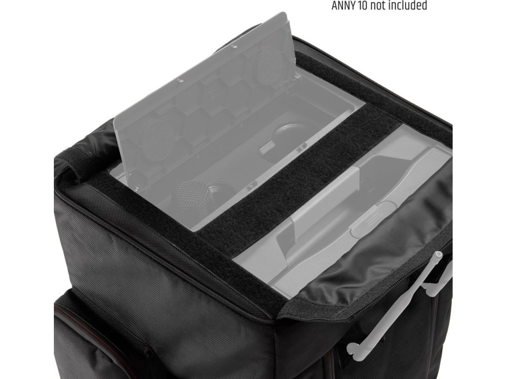 Kilka otworów na rzepy i zamek błyskawiczny oraz duża, zwijana część przednia umożliwiają pełne wykorzystanie głośnika ANNY 10 z założonym pokrowcem ochronnym. 2 zewnętrzne kieszenie po bokach pokrowca ochronnego oferują wystarczająco dużo miejsca do przechowywania akcesoriów, takich jak kable zasilające i kable XLR.