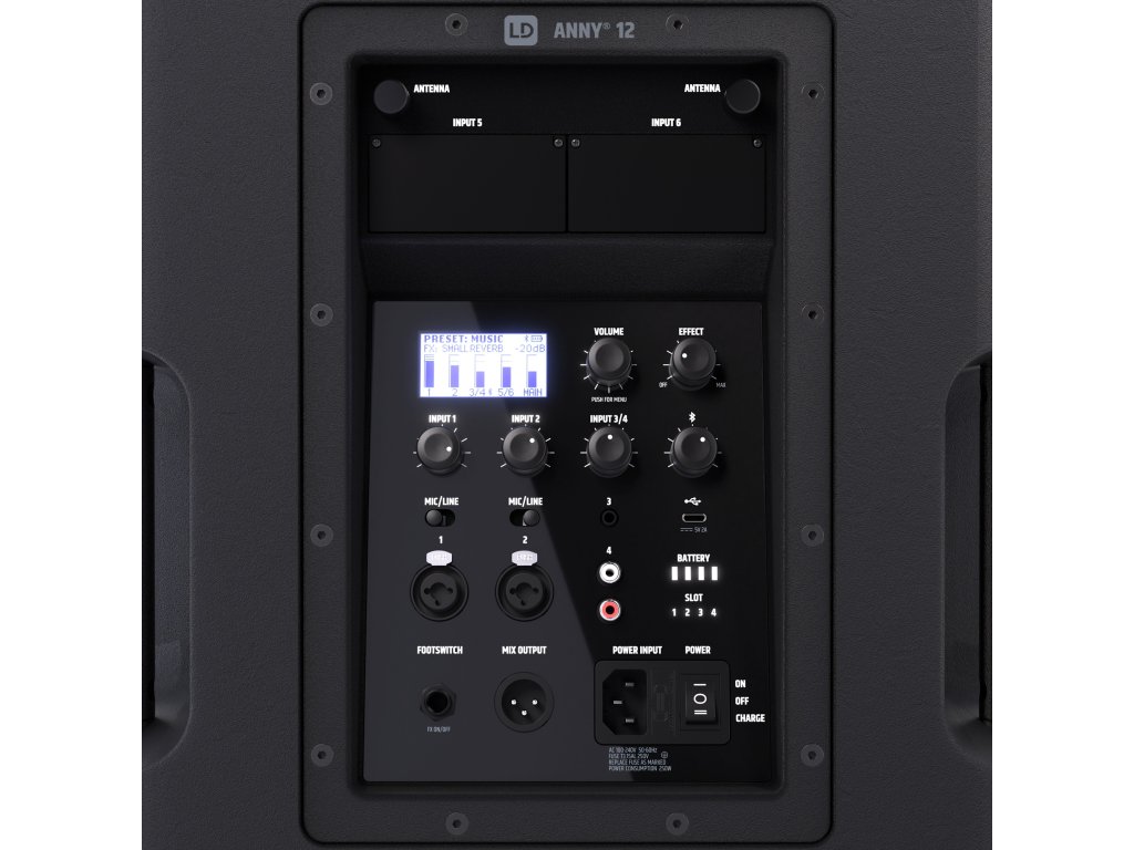 Zintegrowany 6-kanałowy mikser, 3-pasmowy korektor, 5 ustawień wstępnych dla różnych zastosowań (MUSIC, LIVE, VOCAL, ECO, FLAT) oraz efekty takie jak reverb i delay - ten głośnik to świetne połączenie kompleksowych funkcji i doskonałej jakości dźwięku w kompaktowej i wytrzymałej obudowie. ANNY 12 zachwyca wszechstronnymi możliwościami połączeń: dwoma wejściami combo mikrofon/linia, jednym kanałem stereo z gniazdem 3,5 mm (AUX) i wejściami RCA, a także Bluetooth 5.0 z kodekiem AAC. Telefony komórkowe lub tablety można ładować przez port USB-C z tyłu urządzenia ANNY, dzięki czemu są zawsze gotowe do użycia.