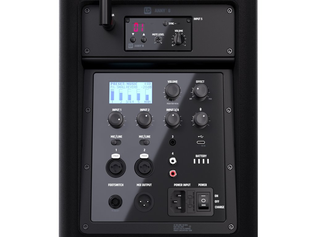 Dzięki zintegrowanemu 5-kanałowemu mikserowi, 3-pasmowemu korektorowi, 5 ustawieniom wstępnym dla różnych zastosowań (MUSIC, LIVE, VOCAL, ECO, FLAT) i efektom, takim jak reverb & delay, łączy w sobie kompleksowe funkcje i doskonałą jakość dźwięku w kompaktowej i ponadczasowej konstrukcji. ANNY 8 zachwyca wszechstronnymi opcjami podłączeń: dwa wejścia combo mikrofon/linia, jeden kanał stereo z gniazdem 3,5 mm (AUX) i wejściami RCA, a także Bluetooth 5.0 z kodekiem AAC. Ta gama wejść pozwala na szeroki zakres ustawień z połączeniem mowy i muzyki. Wejście przełącznika nożnego umożliwia łatwe i bez użycia rąk przełączanie efektów reverb & delay za pomocą zewnętrznego przełącznika nożnego podczas grania lub śpiewania.