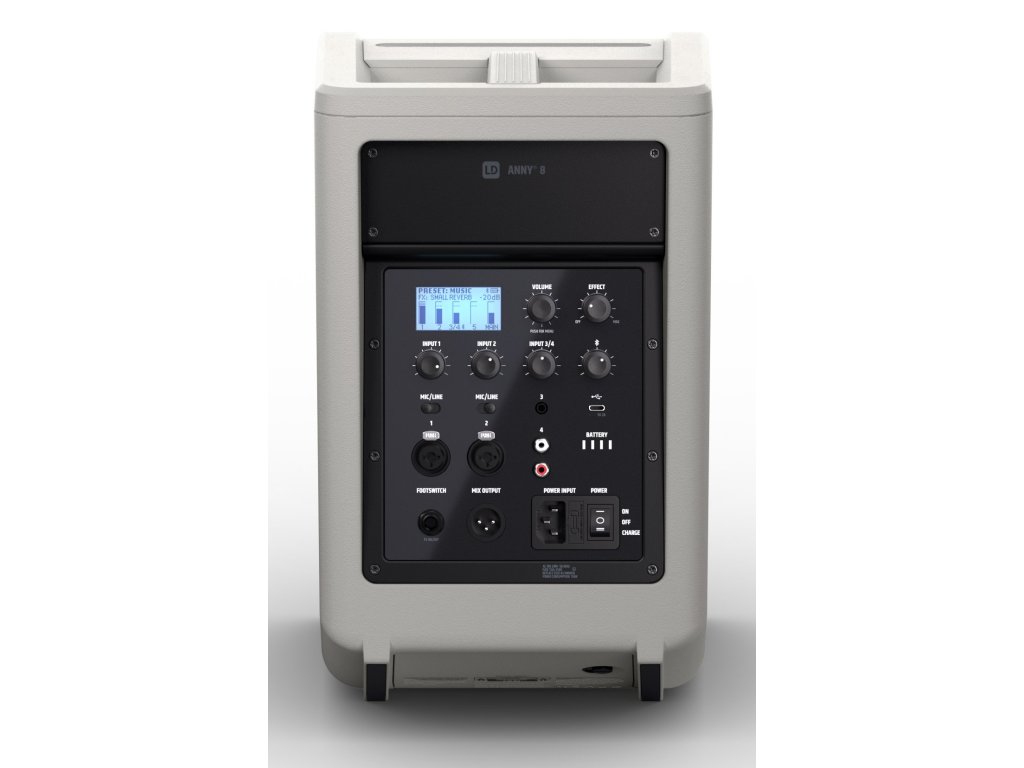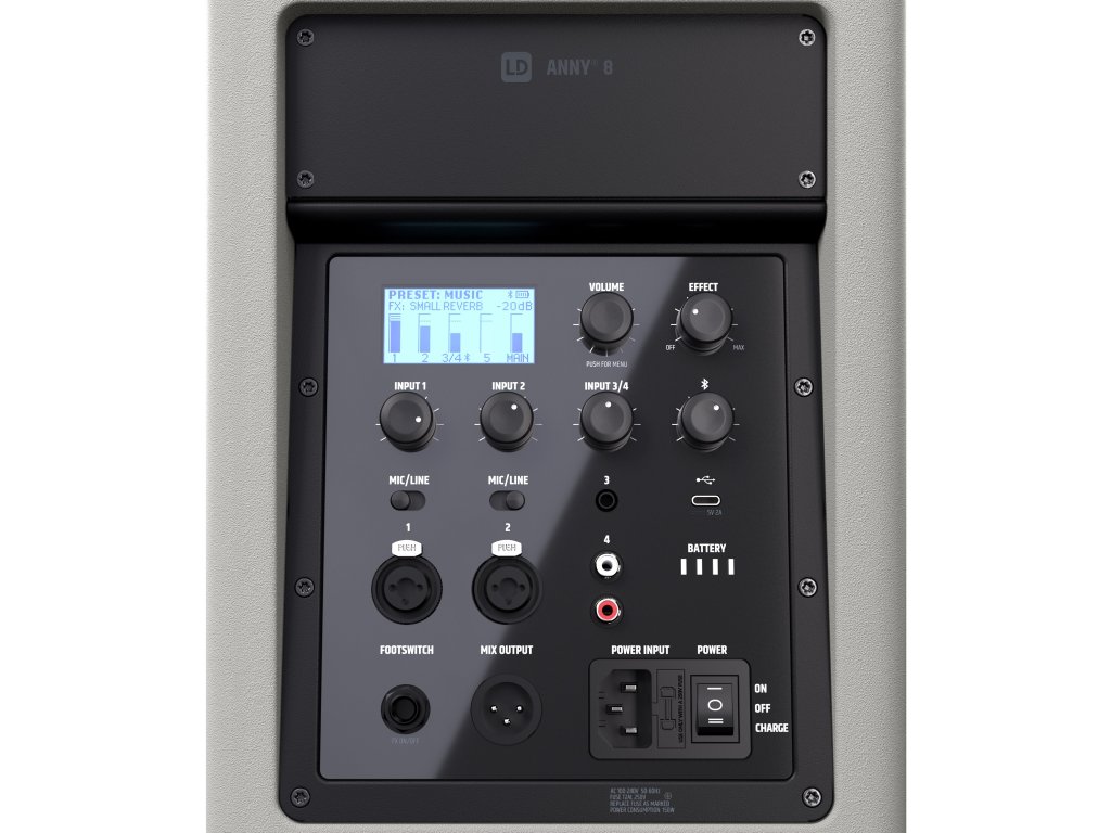 Dzięki zintegrowanemu 5-kanałowemu mikserowi, 3-pasmowemu korektorowi, 5 ustawieniom wstępnym dla różnych zastosowań (MUSIC, LIVE, VOCAL, ECO, FLAT) i efektom, takim jak reverb & delay, łączy w sobie kompleksowe funkcje i doskonałą jakość dźwięku w kompaktowej i ponadczasowej konstrukcji. ANNY 8 zachwyca wszechstronnymi opcjami podłączeń: dwa wejścia combo mikrofon/linia, jeden kanał stereo z gniazdem 3,5 mm (AUX) i wejściami RCA, a także Bluetooth 5.0 z kodekiem AAC. Ta gama wejść pozwala na szeroki zakres ustawień z połączeniem mowy i muzyki. Wejście przełącznika nożnego umożliwia łatwe i bez użycia rąk przełączanie efektów reverb & delay za pomocą zewnętrznego przełącznika nożnego podczas grania lub śpiewania.