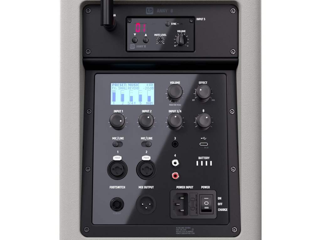 Dzięki zintegrowanemu 5-kanałowemu mikserowi, 3-pasmowemu korektorowi, 5 ustawieniom wstępnym dla różnych zastosowań (MUSIC, LIVE, VOCAL, ECO, FLAT) i efektom, takim jak reverb & delay, łączy w sobie kompleksowe funkcje i doskonałą jakość dźwięku w kompaktowej i ponadczasowej konstrukcji. ANNY 8 zachwyca wszechstronnymi opcjami podłączeń: dwa wejścia combo mikrofon/linia, jeden kanał stereo z gniazdem 3,5 mm (AUX) i wejściami RCA, a także Bluetooth 5.0 z kodekiem AAC. Ta gama wejść pozwala na szeroki zakres ustawień z połączeniem mowy i muzyki. Wejście przełącznika nożnego umożliwia łatwe i bez użycia rąk przełączanie efektów reverb & delay za pomocą zewnętrznego przełącznika nożnego podczas grania lub śpiewania.