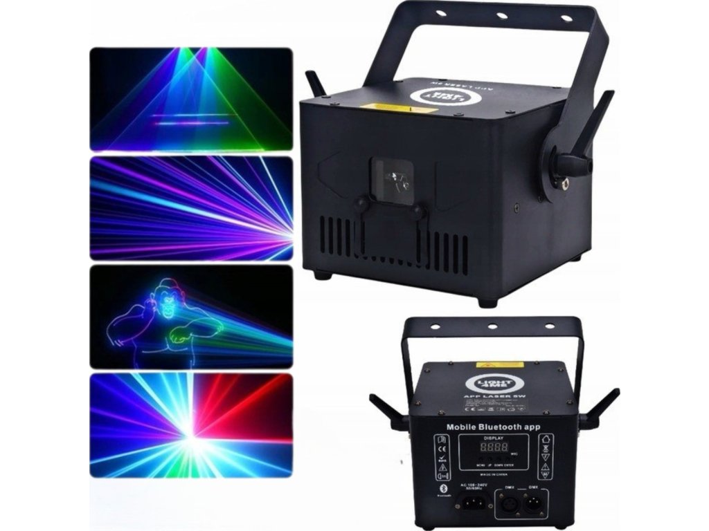 LIGHT4ME APP LASER 5W RGB to wysokiej jakości, profesjonalny efekt świetlny sceniczny w postaci lasera animacyjnego, który wyposażony jest wejście i wyjście DMX oraz możliwość sterowania przez Bluetooth za pomocą aplikacji w urządzeniu mobilnym. Laserowy projektor emituje wiązki o łącznej mocy do 5 watów w kolorze czerwonym, zielonym i niebieskim (RGB), tworząc spektakularne, kolorowe widowisko laserowe. Dzięki wbudowanym efektom dynamicznym, wzorom i animacjom, a także możliwości ręcznego rysowania wzorów, wyboru tekstu animacji, tworzenia i edycji scen bezpośrednio z aplikacji Bluetooth, świetnie sprawdzi się w teatrach, na profesjonalnych scenach muzycznych, dyskotekach, a także do mobilnej pracy DJ-ów.