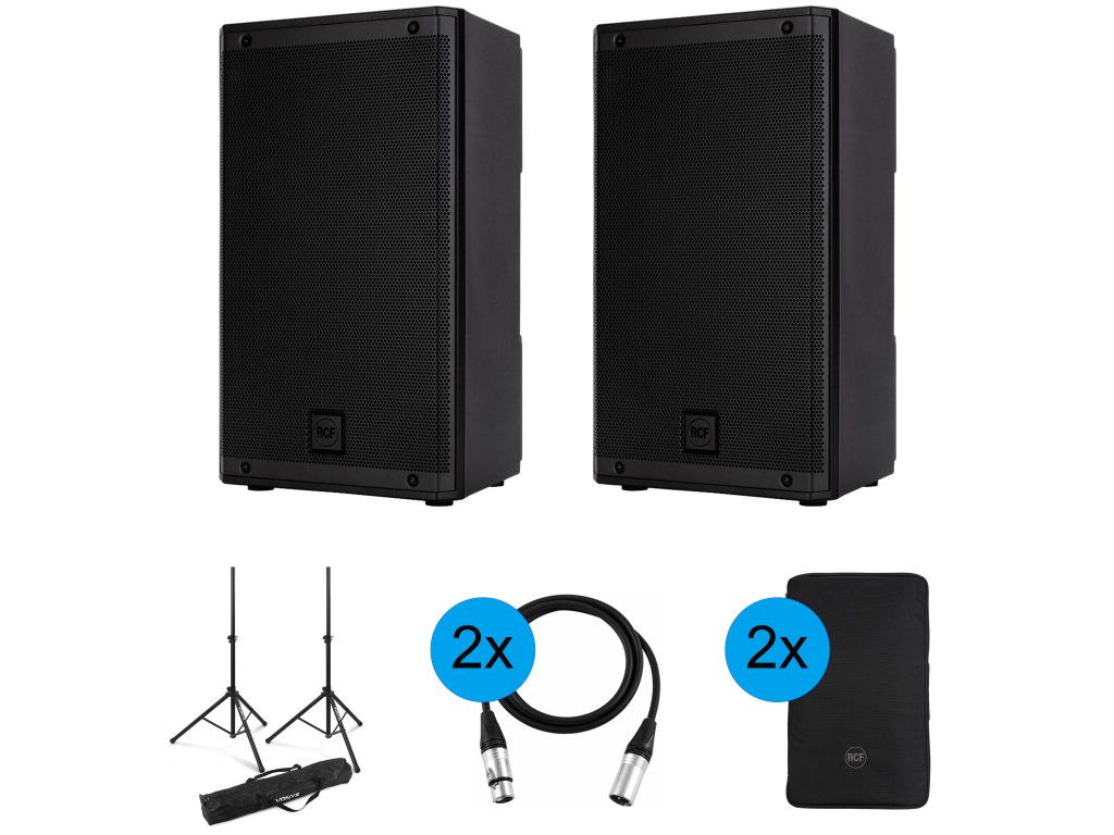 Korzystny zestaw 2 szt. aktywnych kolumn głośnikowych RCF ART 910-A, 2 szt. oryginalnych pokrowców na kolumny głośnikowe RCF, 2 szt. kabli połączeniowych Vonyx CX310-6 6m oraz zestawu statywów z pokrowcem transportowym Vonyx LS01K.