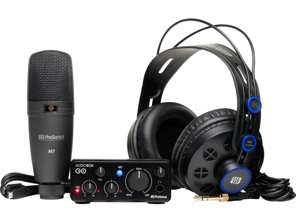 Zestaw PreSonus AudioBox GO Creator Bundle to niedrogie, uniwersalne narzędzie do tworzenia nagrań o studyjnej jakości. Pakiet PreSonus AudioBox GO Creator Bundle zawiera ultrakompaktowy i zaskakująco wydajny interfejs audio USB AudioBox GO 2x2 / 24-bit / 96 kHz, profesjonalne oprogramowanie do nagrywania Studio One Pro 7, które jest częścią 6-miesięcznej licencji Studio One Pro+, słuchawki studyjne HD7 o wysokiej rozdzielczości oraz wszechstronny kardioidalny mikrofon pojemnościowy M7 z adapterem do statywu mikrofonowego i osłoną przeciwwietrzną.