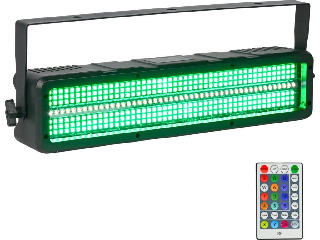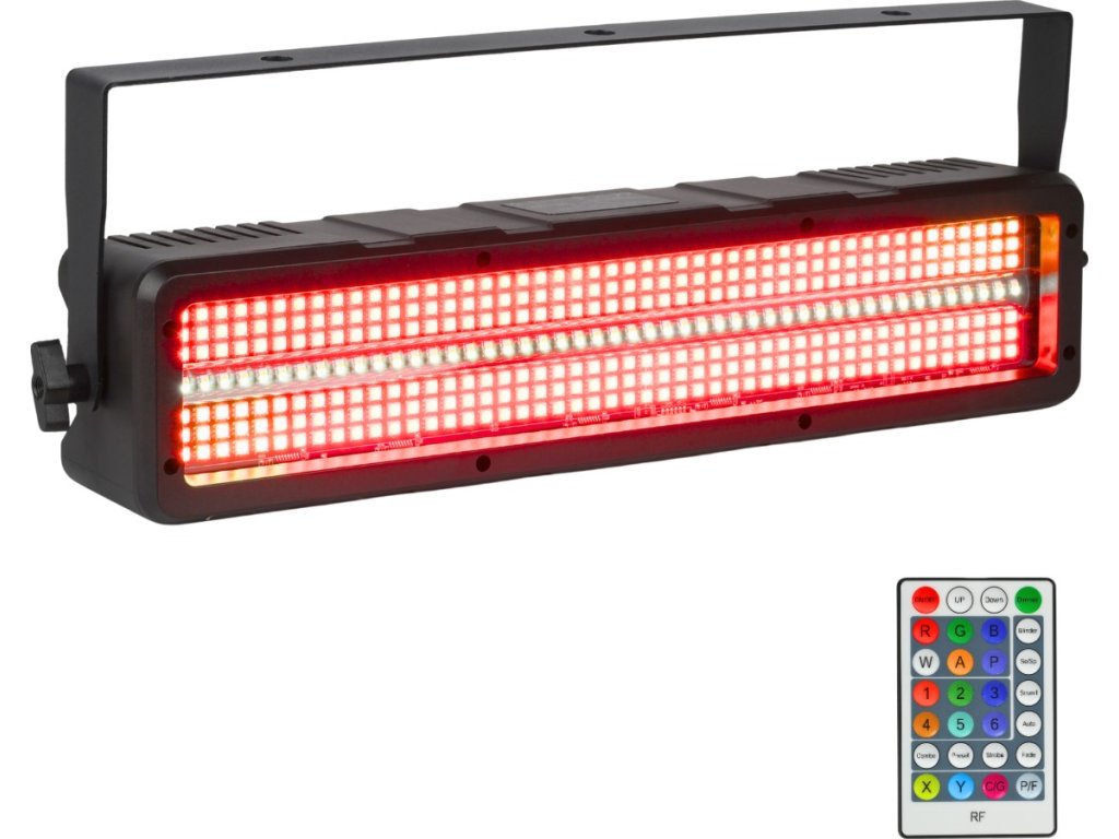 - Typ urządzenia: stroboskop sceniczny z bezprzewodowym pilotem i uchwytem montażowym- Źródło światła: 48x1W CW/A SMD3030 LED 2w1 + 288x0,2W RGB SMD5050 LED 3w1