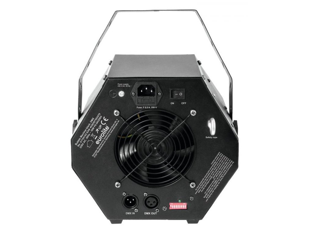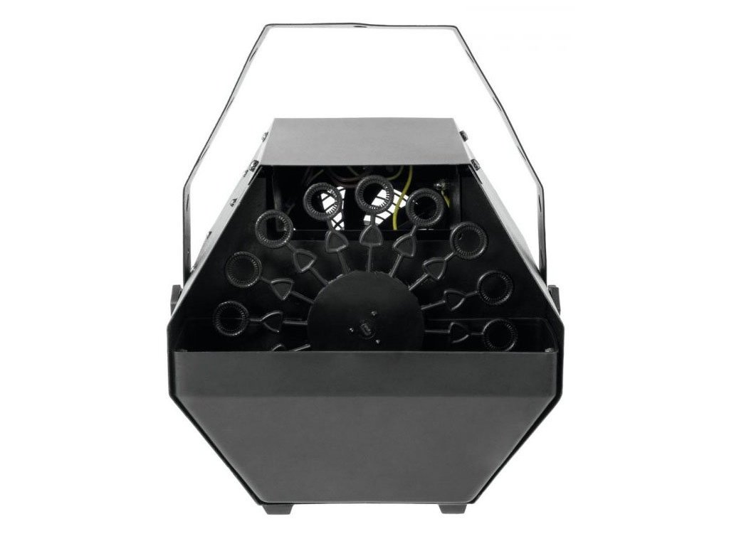 Uniwersalna i kompaktowa wytwornica baniek mydlanych, która za pomocą wydajnego wentylatora i obracającego się koła "bubble" ze zbiornikiem na około 2l płynu nadaje się do stałych instalacji oraz do użytku mobilnego. Sterowanie za pomocą sterownika DMX (2 kanały) - przełączniki DIP. To urządzenie wytwarza popularne bańki mydlane i rozprowadza je po pomieszczeniu lub przestrzeni. Do urządzenia należy wlać specjalny płyn (nr kat. 51705280) nie wchodzi w skład produktu, płyny są całkowicie nieszkodliwe dla zdrowia i rozcieńczalne wodą.