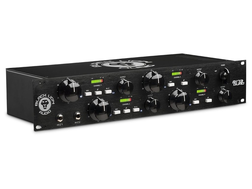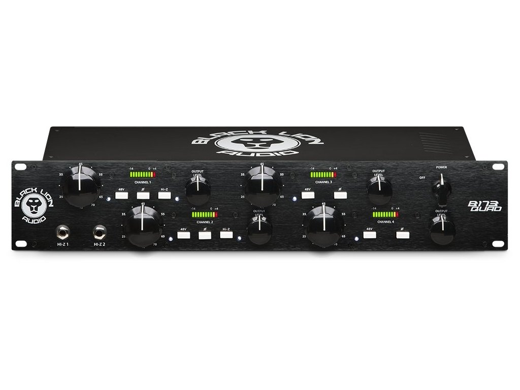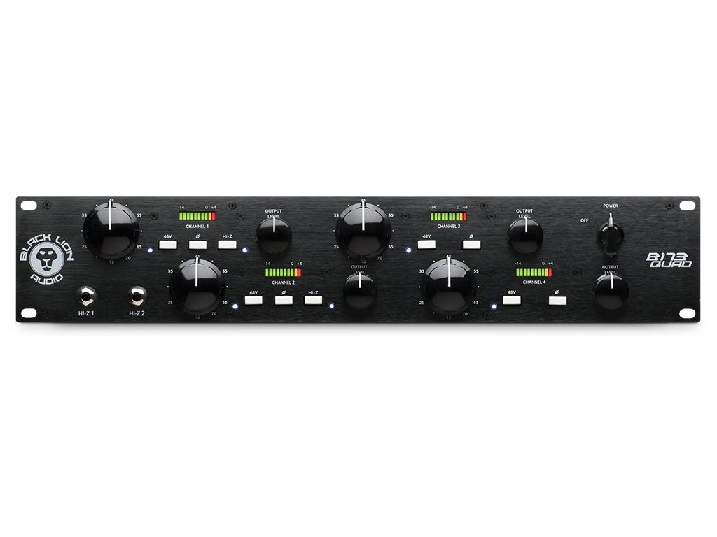 Black Lion Audio - B173 Quad to czterokanałowy przedwzmacniacz mikrofonowy inspirowany obwodami ze znanej klasyki "1073ki". Ulepszone wzmocnienie i niższy poziom szumu torują drogę do czystszego dźwięku z niższymi zniekształceniami, podczas gdy transformatory wejściowe i wyjściowe Cinemag utrzymują dźwięk gładki i ciepły. Dwa wejścia DI (Hi-Z) na przednim panelu zapewniają gitarom, klawiszom i syntezatorom bogate harmonicznie brzmienie, a stopniowany zysk wejściowy i zmienne tłumienie wyjścia umożliwiają doskonałą kontrolę nad saturacją transformatora.