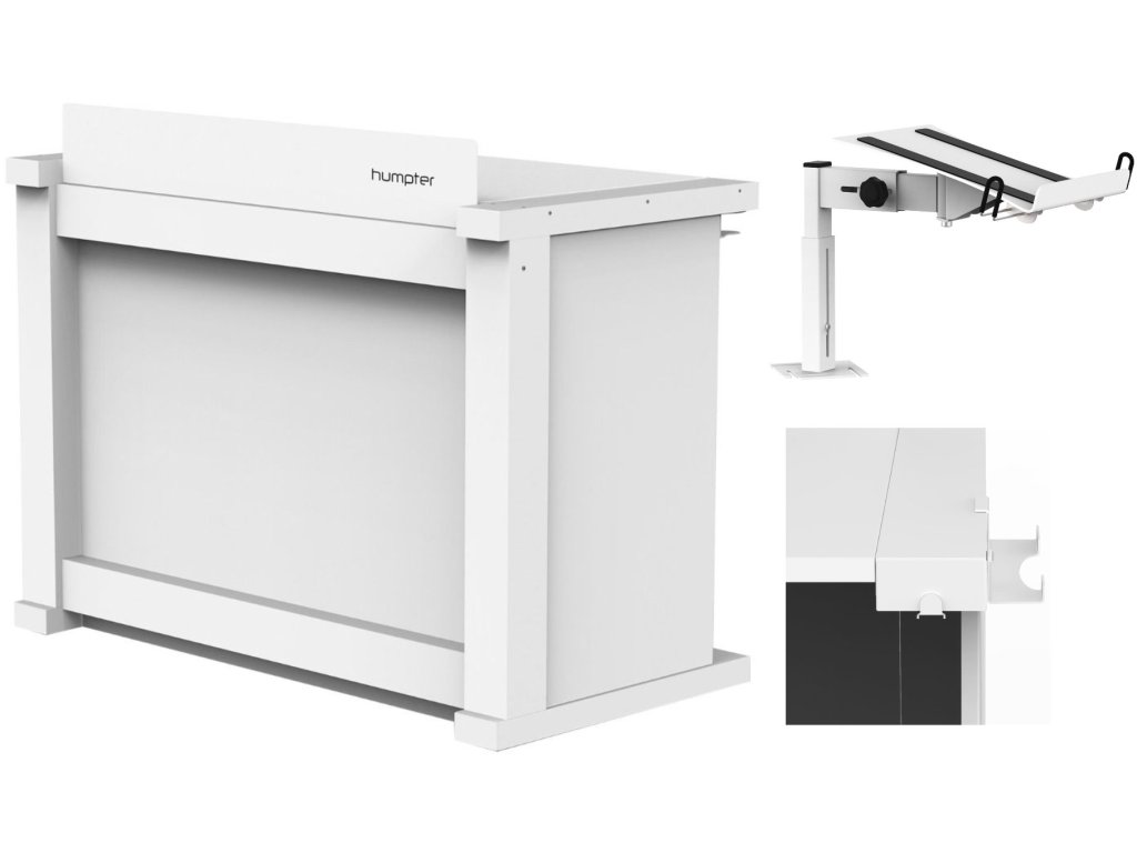 Korzystny zestaw profesjonalnego stołu DJ-skiego Humpter B3 ze stojakiem na laptopa i bocznym uchwytem na mikrofon. Kolor biały.
