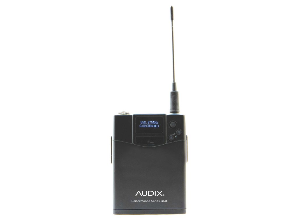 Bezprzewodowy nadajnik paskowy Bodypack Audix B60. Odpowiedni do mikrofonów krawatowych, nagłownych i instrumentalnych. Nadajnik jest wykonany z metalowej, ale lekkiej konstrukcji. Ponadto jest wyposażony w bardzo kontrastowy wyświetlacz LED ze wskaźnikiem stanu baterii i częstotliwości.