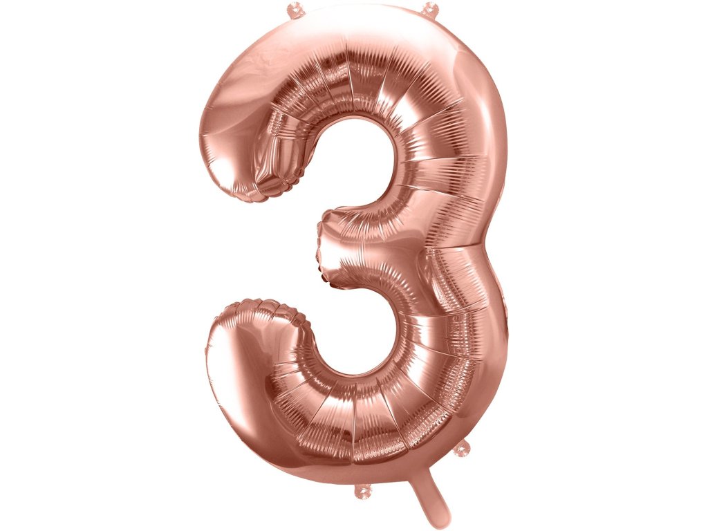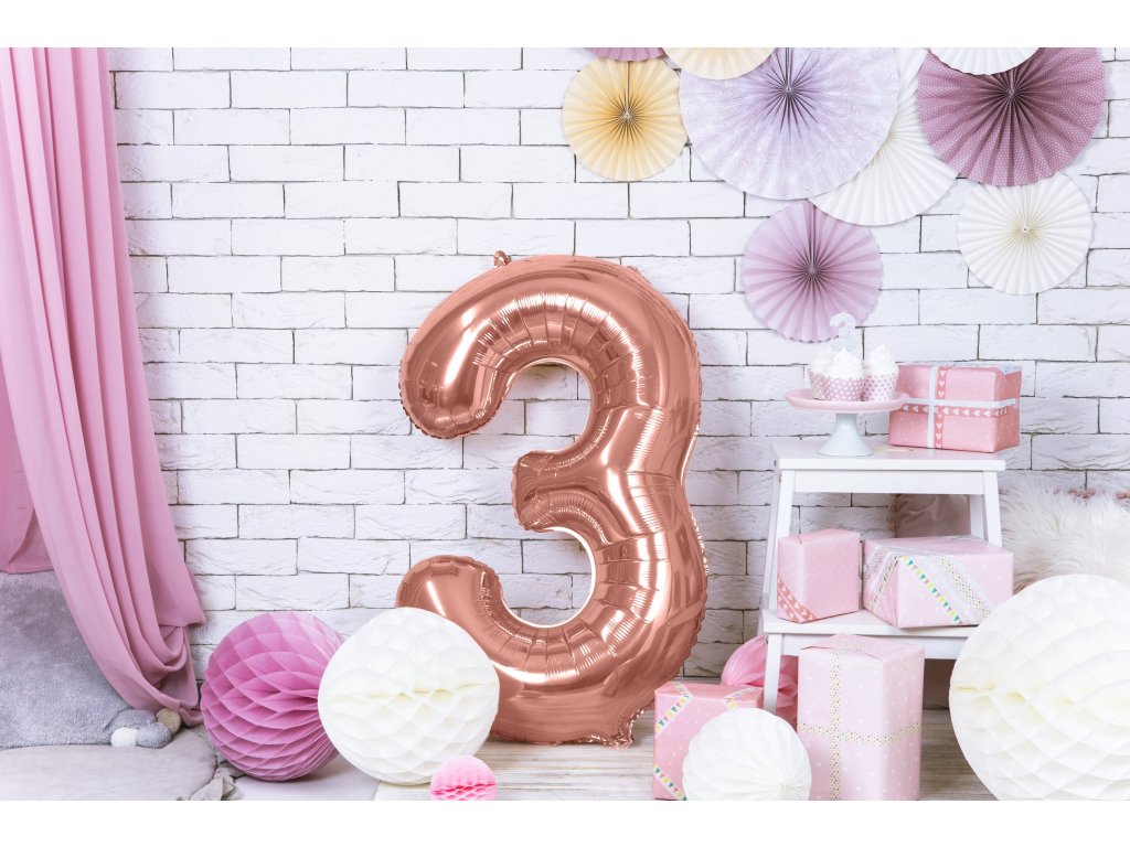 Metaliczny balon foliowy numer ''3'', różowo-złoty, rozmiar przed napompowaniem ok. 100 cm (39''), rozmiar po napompowaniu ok. 86 cm (34''). Napompuj helem lub powietrzem.