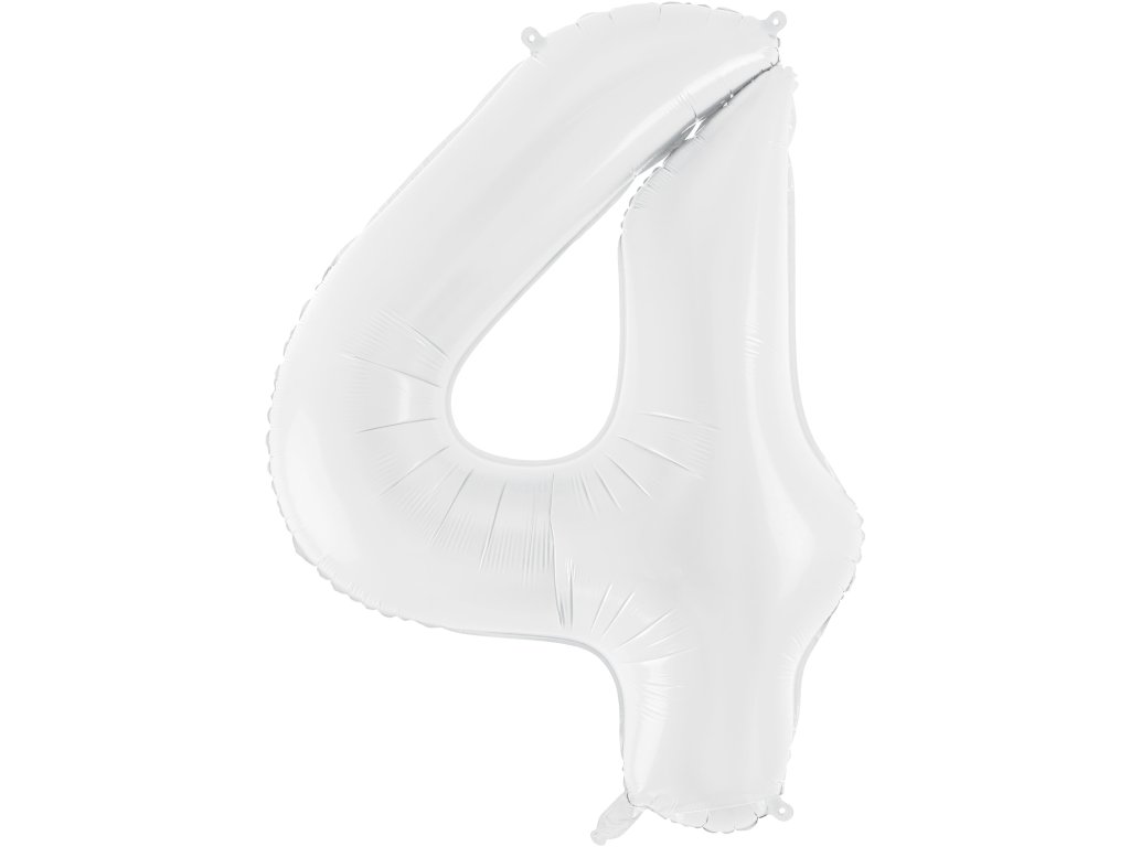 Balon foliowy numer "4" w kolorze białym, rozmiar przed napompowaniem ok. 100 cm (39''), rozmiar po napompowaniu ok. 86 cm (34''). Napompuj powietrzem lub helem.