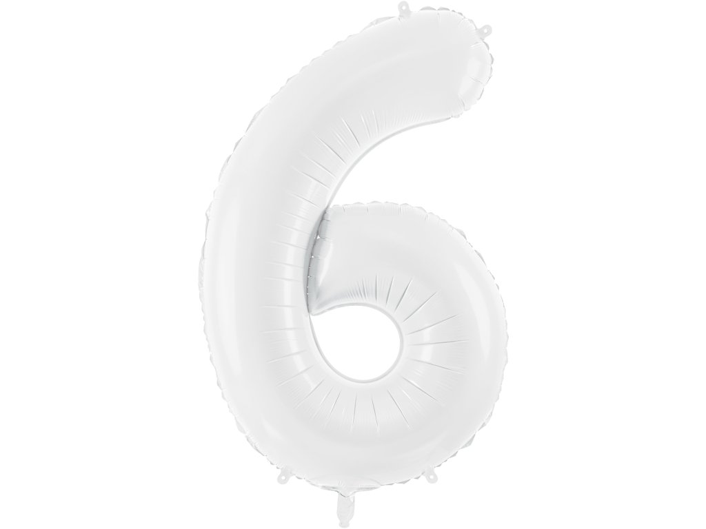 Balon foliowy numer ''6'' w kolorze białym, rozmiar przed napompowaniem ok. 100 cm (39''), rozmiar po napompowaniu ok. 86 cm (34''). Napompuj powietrzem lub helem.