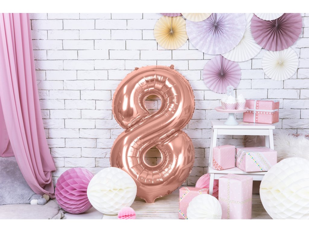 Metaliczny balon foliowy numer ''8'', w kolorze różowego złota, rozmiar przed napompowaniem ok. 100 cm (39''), rozmiar po napompowaniu ok. 86 cm (34''). Napompuj helem lub powietrzem.