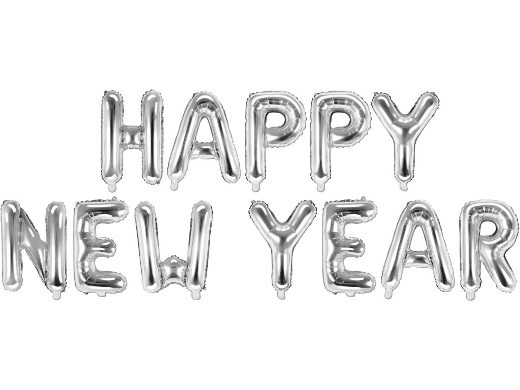 Metaliczny balon foliowy Happy New Year w kolorze srebrnym, rozmiar przed napompowaniem ok. 422 x 46 cm (166 x 18''), rozmiar po napompowaniu ok. 370 x 35 cm (145,5 x 14''). Napompuj powietrzem. Zestaw zawiera słomkę i wstążkę.