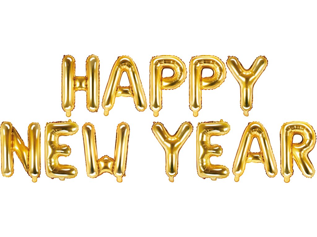 Balon z metalizowanej folii Happy New Year w kolorze złotym, rozmiar przed napompowaniem ok. 422 x 46 cm (166 x 18''), rozmiar po napompowaniu ok. 370 x 35 cm (145,5 x 14''). Napompuj powietrzem.