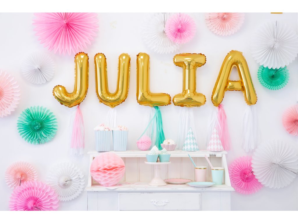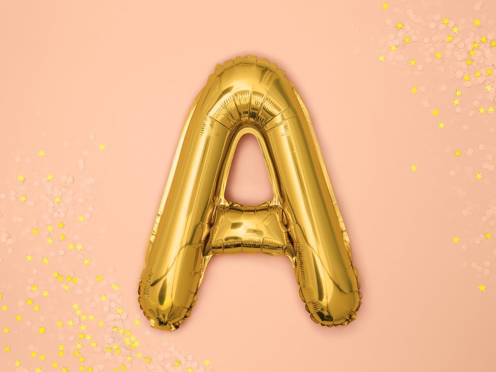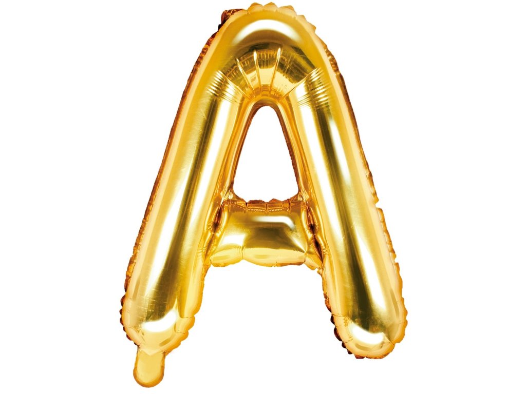Metaliczny balon foliowy litera ''A'', złoty, rozmiar przed napompowaniem ok. 40 cm, wysokość ok. 35 cm. Napompuj powietrzem.