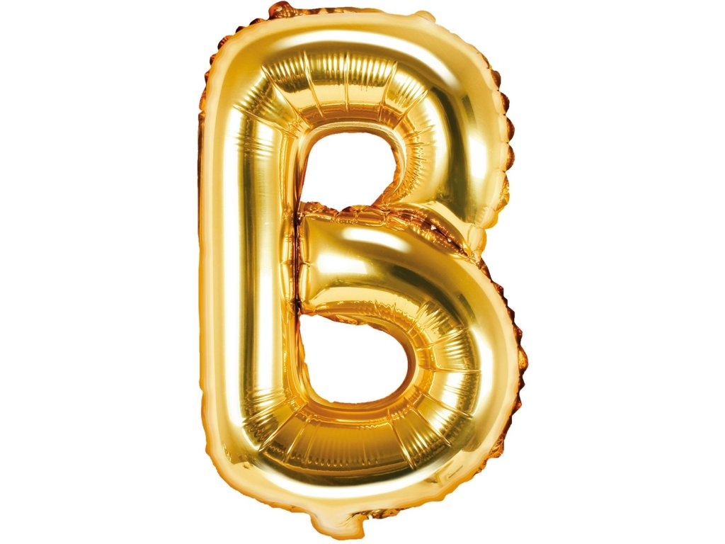 Metaliczny balon foliowy litera ''B'', złoty, wielkość przed napompowaniem ok. 40 cm, wysokość ok. 35 cm. Napompuj powietrzem.