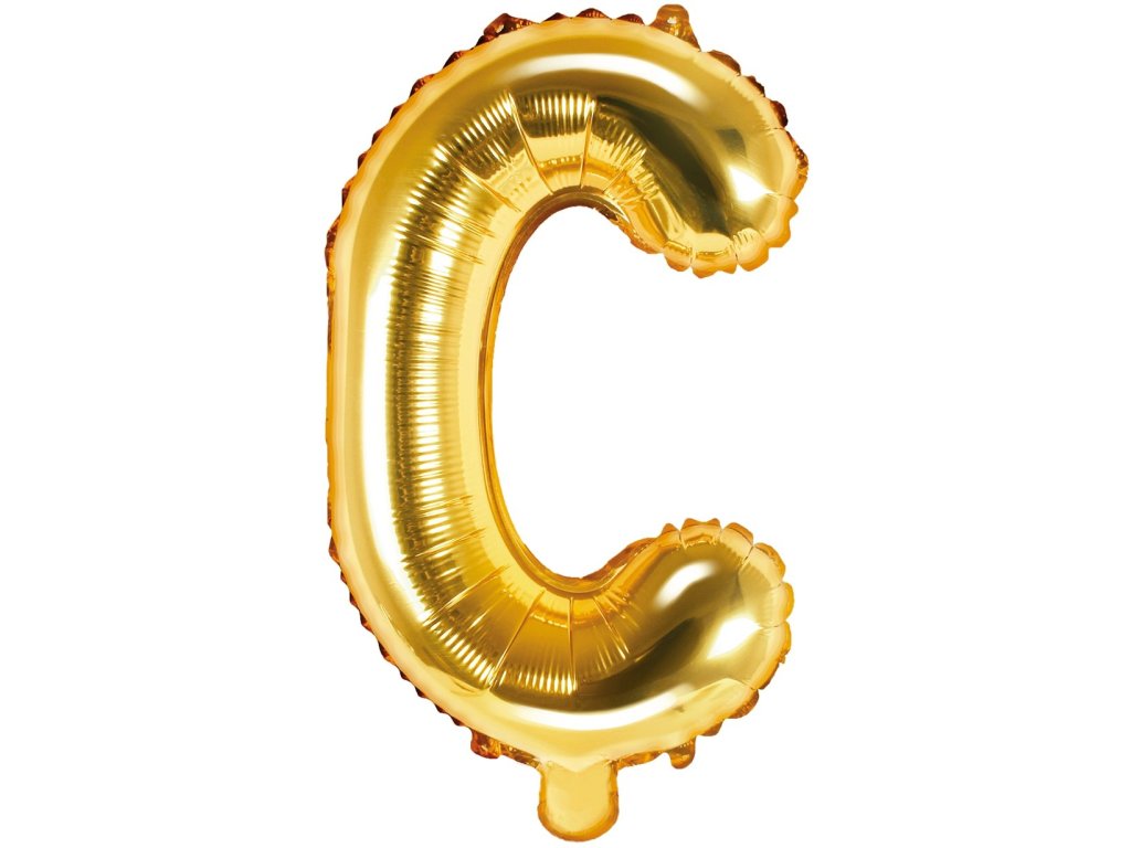 Metaliczny balon foliowy litera ''C'', złoty, wielkość przed napompowaniem ok. 40 cm, wysokość ok. 35 cm. Napompuj powietrzem.