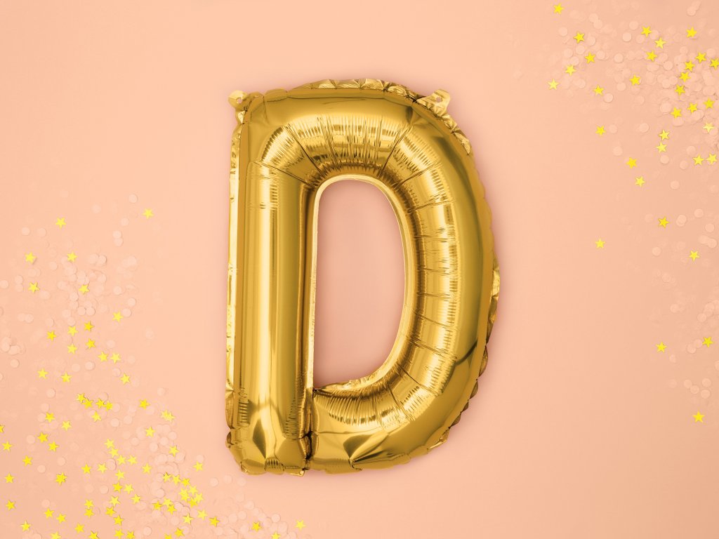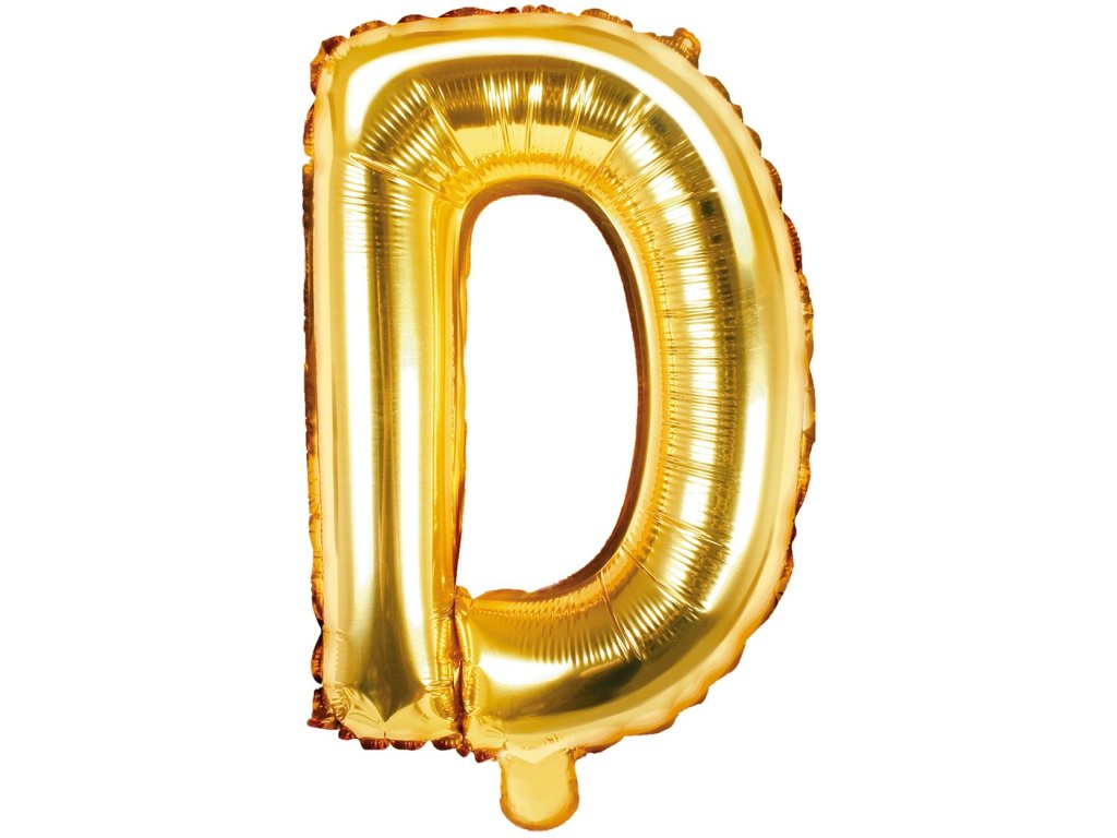 Metaliczny balon foliowy litera ''D'', złoty, wielkość przed napompowaniem ok. 40 cm, wysokość ok. 35 cm. Napompuj powietrzem.Parametry dodatkowe