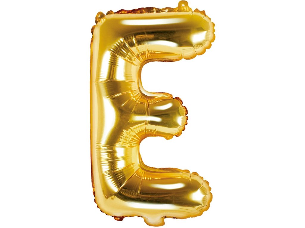 Metaliczny balon foliowy litera ''E'', złoty, rozmiar przed napompowaniem ok. 40 cm, wysokość ok. 35 cm. Napompuj powietrzem.Parametry dodatkowe