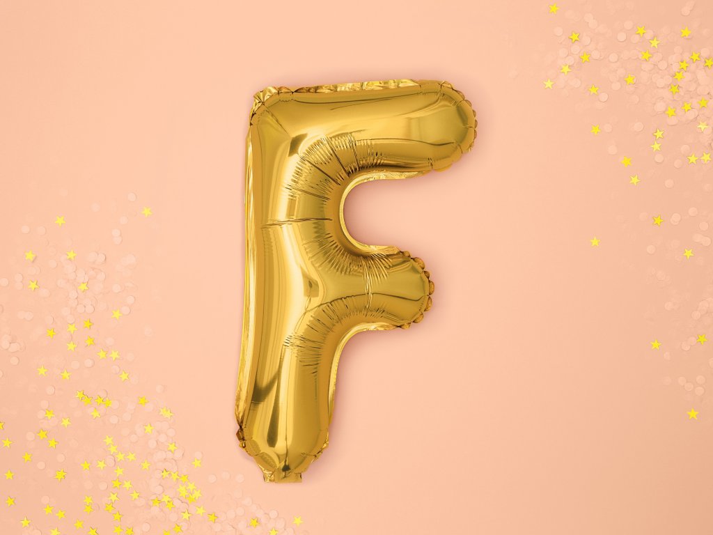 Metalowy balon foliowy litera ''F'', złoty, rozmiar przed napompowaniem ok. 40 cm, wysokość ok. 35 cm. Napompuj powietrzem.