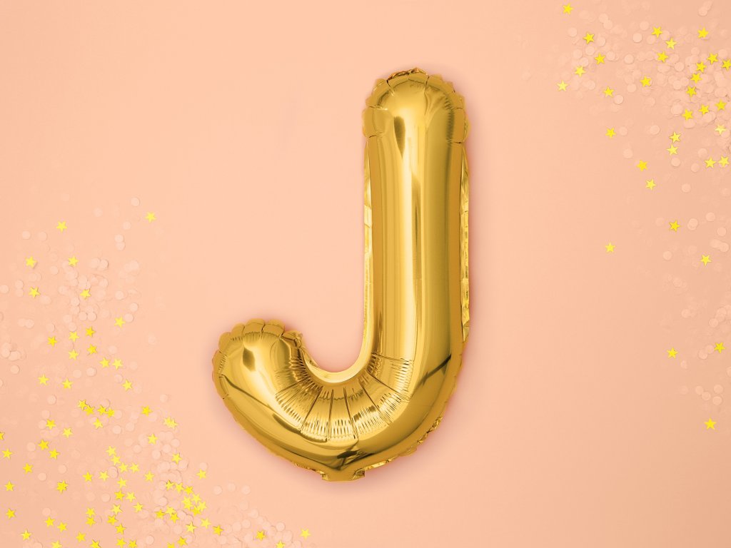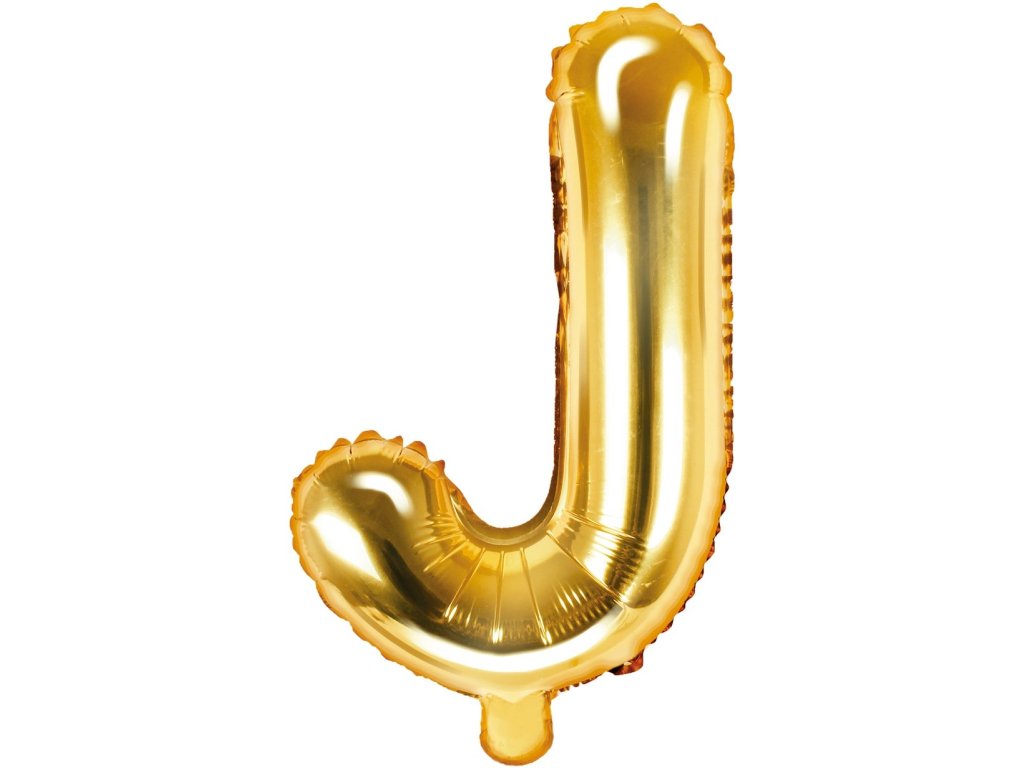 Metaliczny balon foliowy litera ''J'', złoty, wielkość przed napompowaniem ok. 40 cm, wysokość ok. 35 cm. Napompuj powietrzem.Parametry dodatkowe