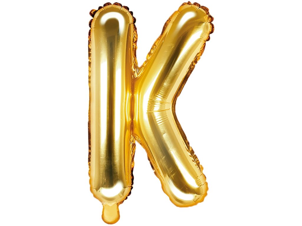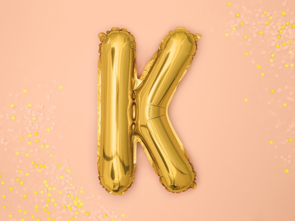 Metaliczny balon foliowy litera ''K'', złoty, rozmiar przed napompowaniem ok. 40 cm, wysokość ok. 35 cm. Napompuj powietrzem.Parametry dodatkowe