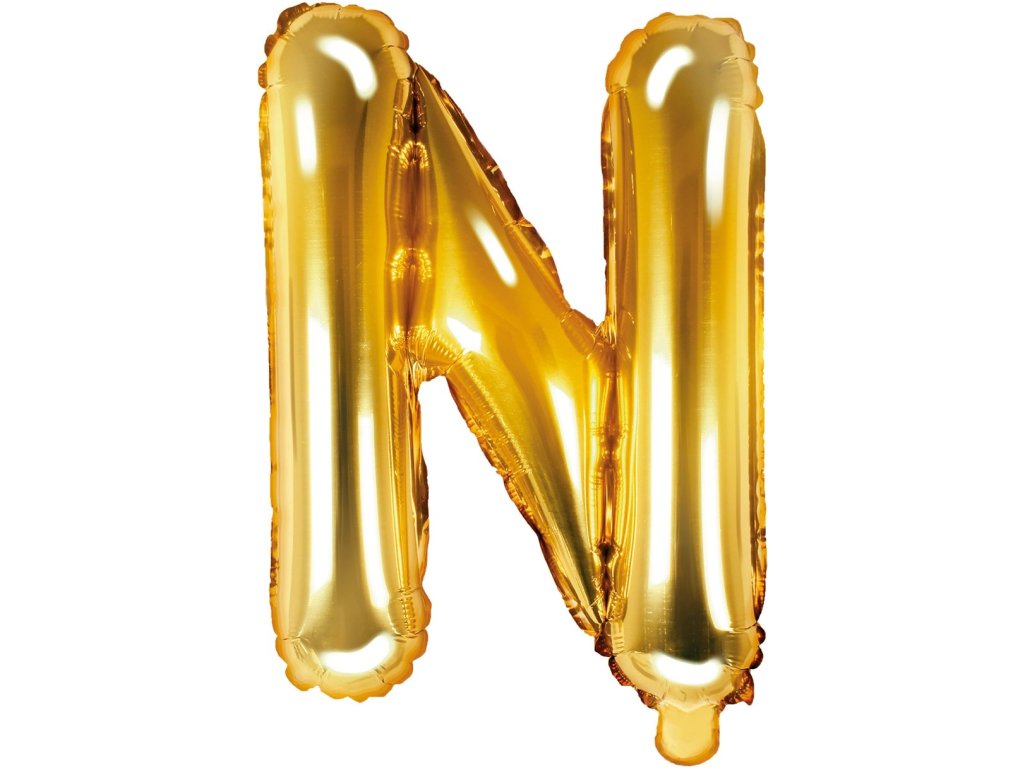 Metaliczny balon foliowy litera ''N'', złoty, wielkość przed napompowaniem ok. 40 cm, wysokość ok. 35 cm. Napompuj powietrzem.Parametry dodatkowe