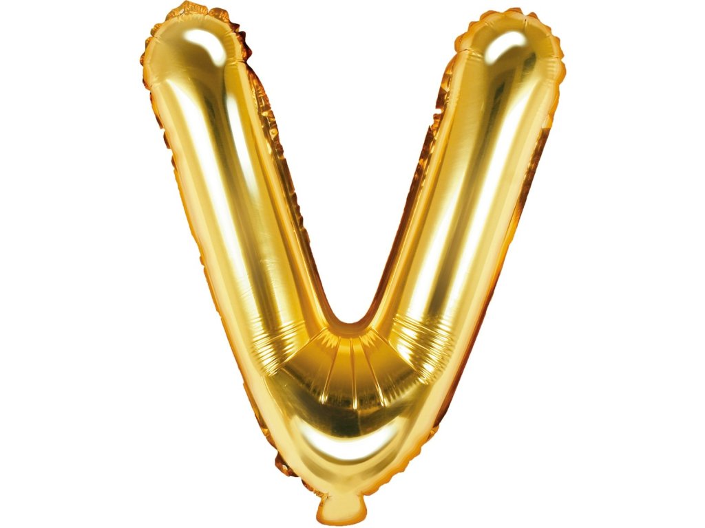 Metaliczny balon foliowy litera ''V'', złoty, wielkość przed napompowaniem ok. 40 cm, wysokość ok. 35 cm. Napompuj powietrzem.Parametry dodatkowe