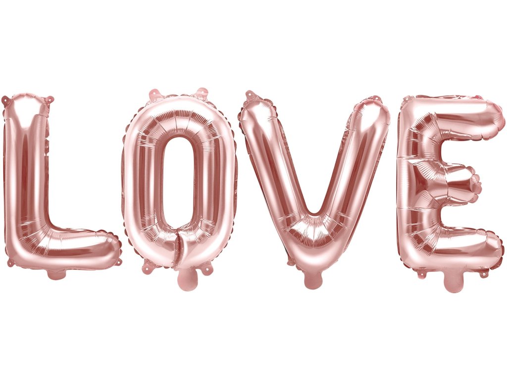 Metalowy balon foliowy Love, różowo-złoty, rozmiar około 140 x 35 cm.