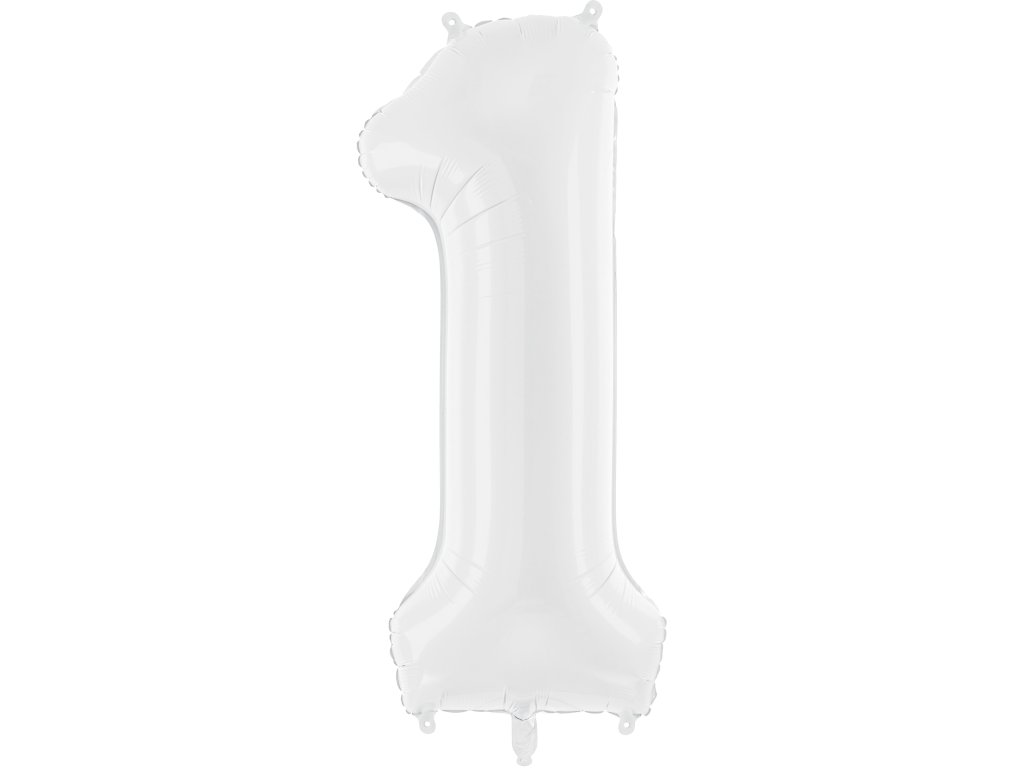 Balon foliowy numer "1" w kolorze białym, rozmiar przed napompowaniem ok. 100 cm (39''), rozmiar po napompowaniu ok. 86 cm (34''). Napompuj powietrzem lub helem.