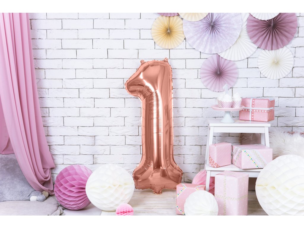Metalowy balon foliowy numer "1", różowo-złoty, rozmiar przed napompowaniem ok. 100 cm (39''), rozmiar po napompowaniu ok. 86 cm (34''). Napompuj helem lub powietrzem.