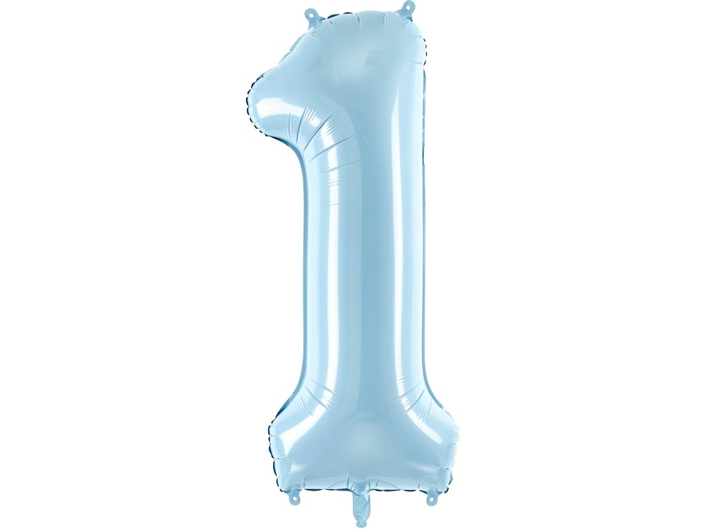 Balon z pastelowej folii numer ''1'', jasnoniebieski, rozmiar przed napompowaniem ok. 100 cm (39''), rozmiar po napompowaniu ok. 86 cm (34''). Napompuj helem lub powietrzem.