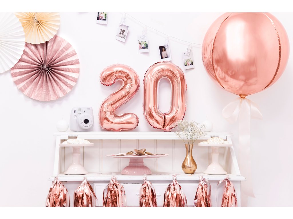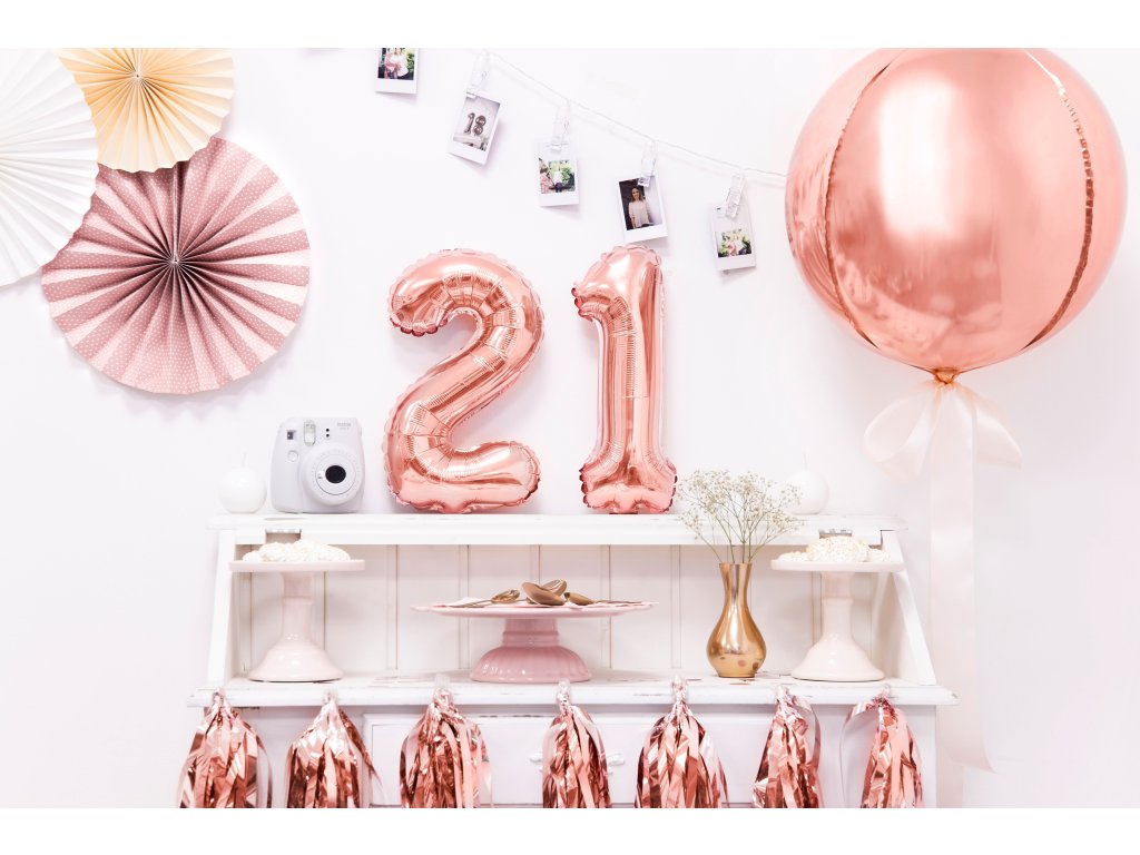 Metaliczny balon foliowy numer ''2'', różowo-złoty, rozmiar przed napompowaniem ok. 40 cm (16''), rozmiar po napompowaniu ok. 35 cm (14'').