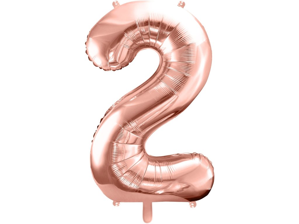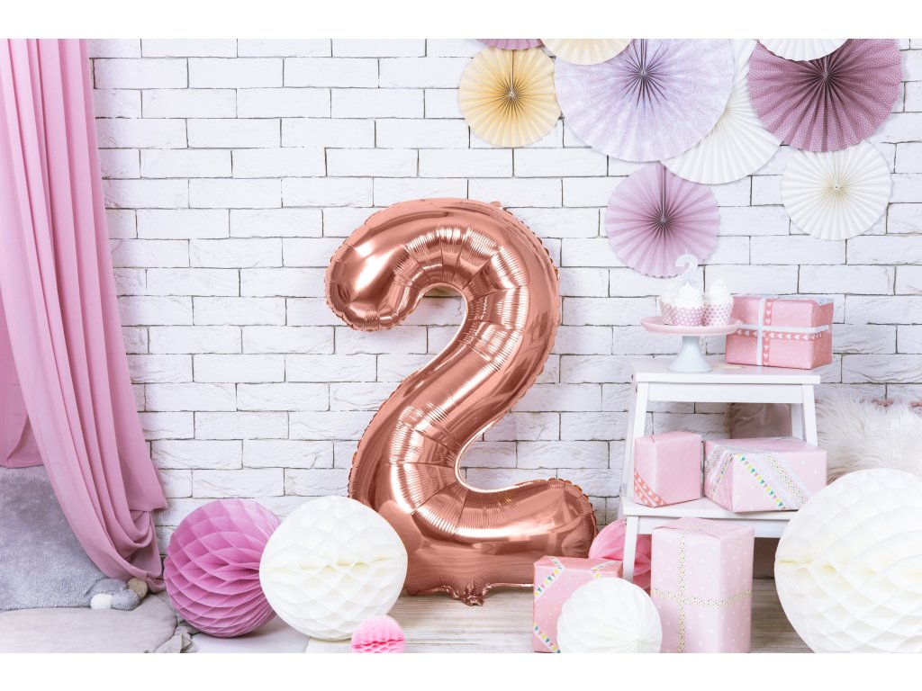 Metalowy balon foliowy numer ''2'', różowo-złoty, rozmiar przed napompowaniem ok. 100 cm (39''), rozmiar po napompowaniu ok. 86 cm (34''). Napompuj helem lub powietrzem.