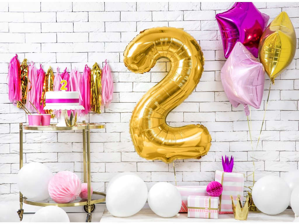 Balon z metalizowanej folii numer ''2'', złoty, rozmiar przed napompowaniem ok. 100 cm (39''), rozmiar po napompowaniu ok. 86 cm (34''). Napompuj helem lub powietrzem.