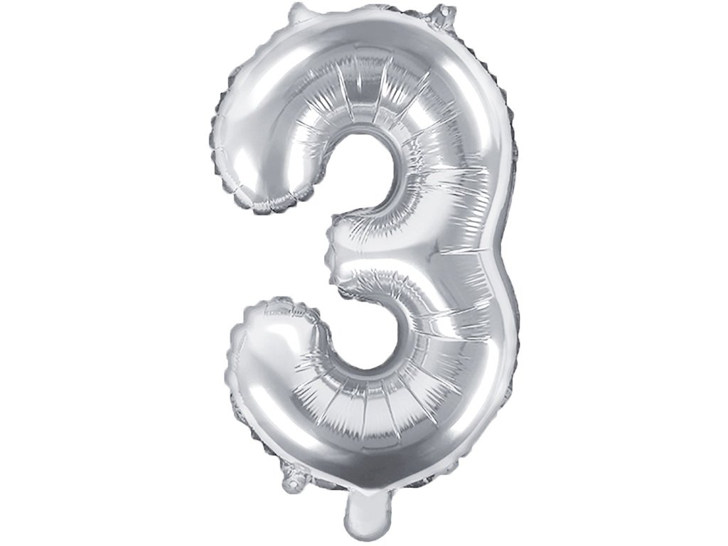 Metalizowany balon foliowy numer ''3'', srebrny, rozmiar przed napompowaniem ok. 40 cm (16''), rozmiar po napompowaniu ok. 35 cm (14'').