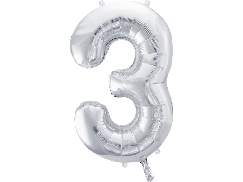 Metalowy balon foliowy numer ''3'', srebrny, rozmiar przed napompowaniem ok. 100 cm (39''), rozmiar po napompowaniu ok. 86 cm (34''). Napompuj helem lub powietrzem.