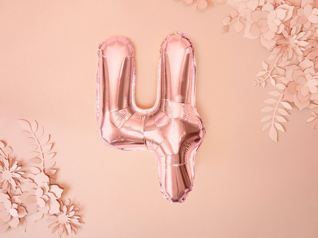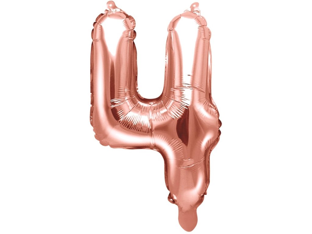 Metaliczny balon foliowy numer ''4'', różowo-złoty, rozmiar przed napompowaniem ok. 40 cm (16''), rozmiar po napompowaniu ok. 35 cm (14'').