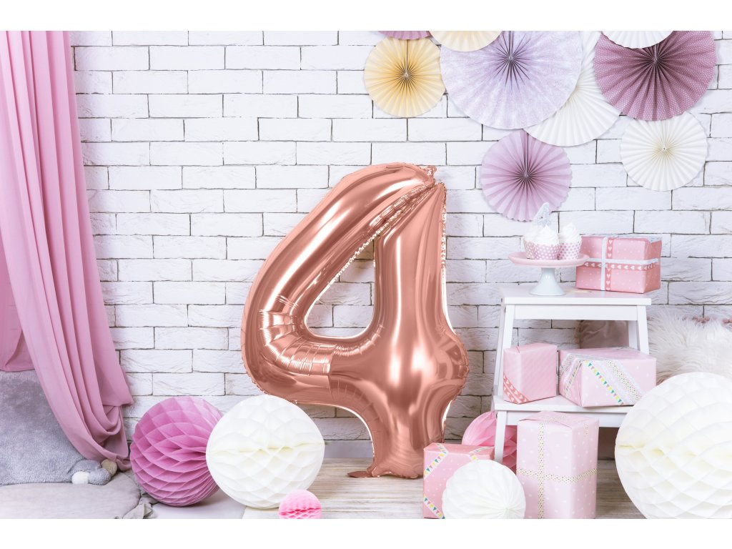 Balon z metalizowanej folii numer ''4'', złoty, rozmiar przed napompowaniem ok. 100 cm (39''), rozmiar po napompowaniu ok. 86 cm (34''). Napełnij helem i powietrzem.