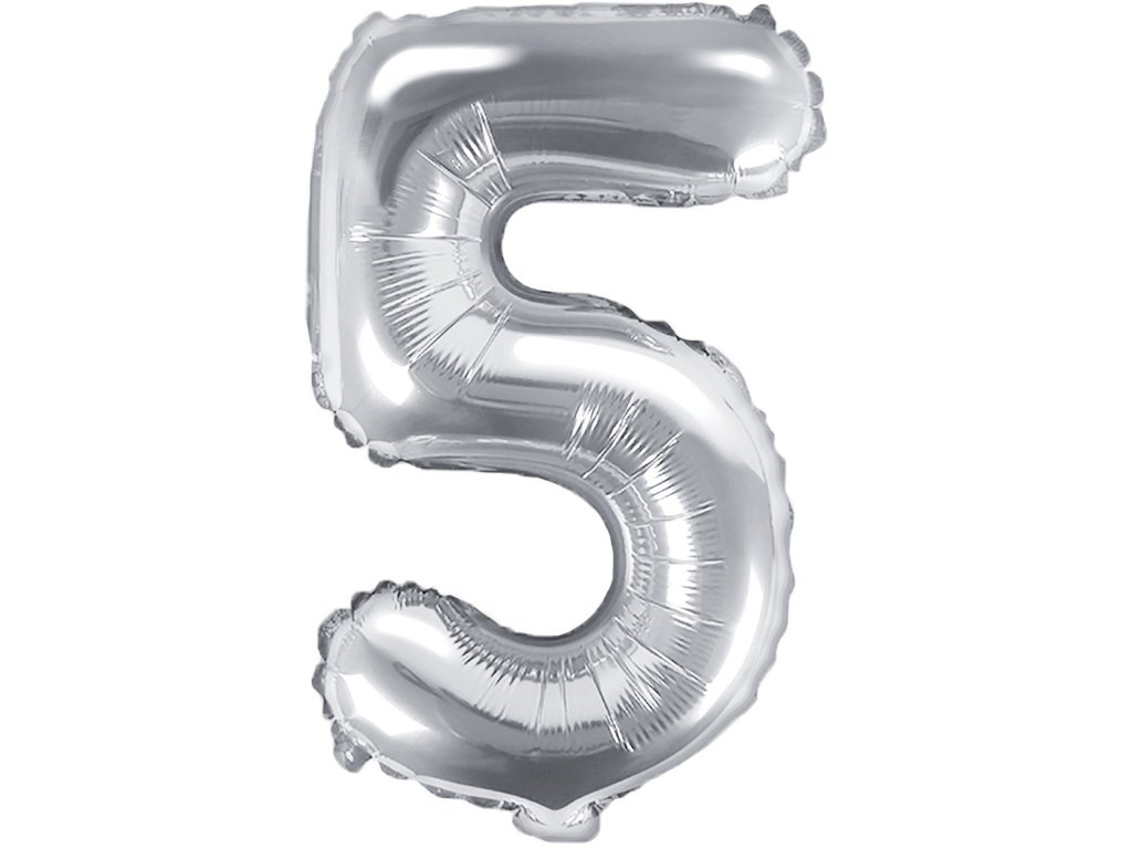 Metaliczny balon foliowy numer ''5'', srebrny, rozmiar przed napompowaniem ok. 40 cm (16''), rozmiar po napompowaniu ok. 35 cm (14'').