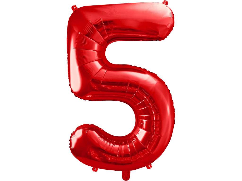Balon z metalizowanej folii numer ''5'' w kolorze czerwonym, rozmiar przed napompowaniem ok. 100 cm (39''), rozmiar po napompowaniu ok. 86 cm (34''). Napompuj helem lub powietrzem.