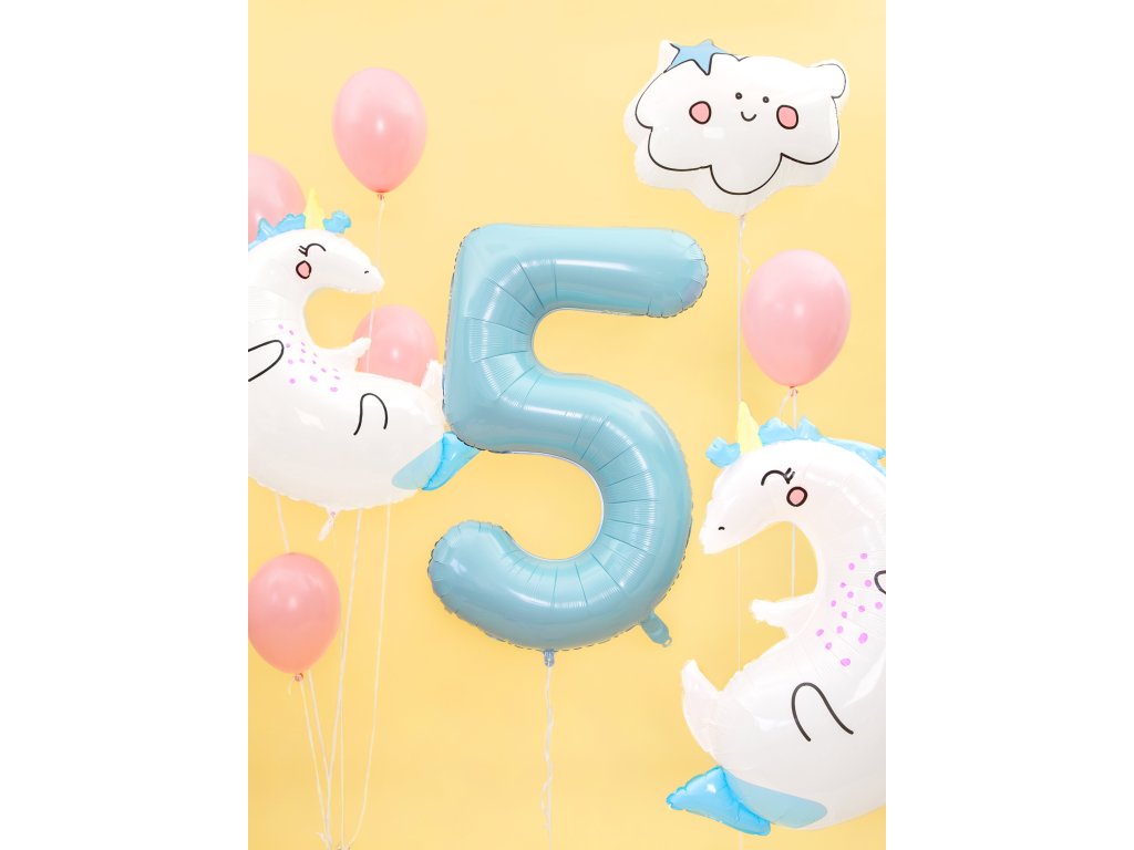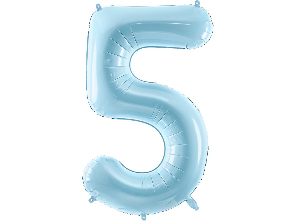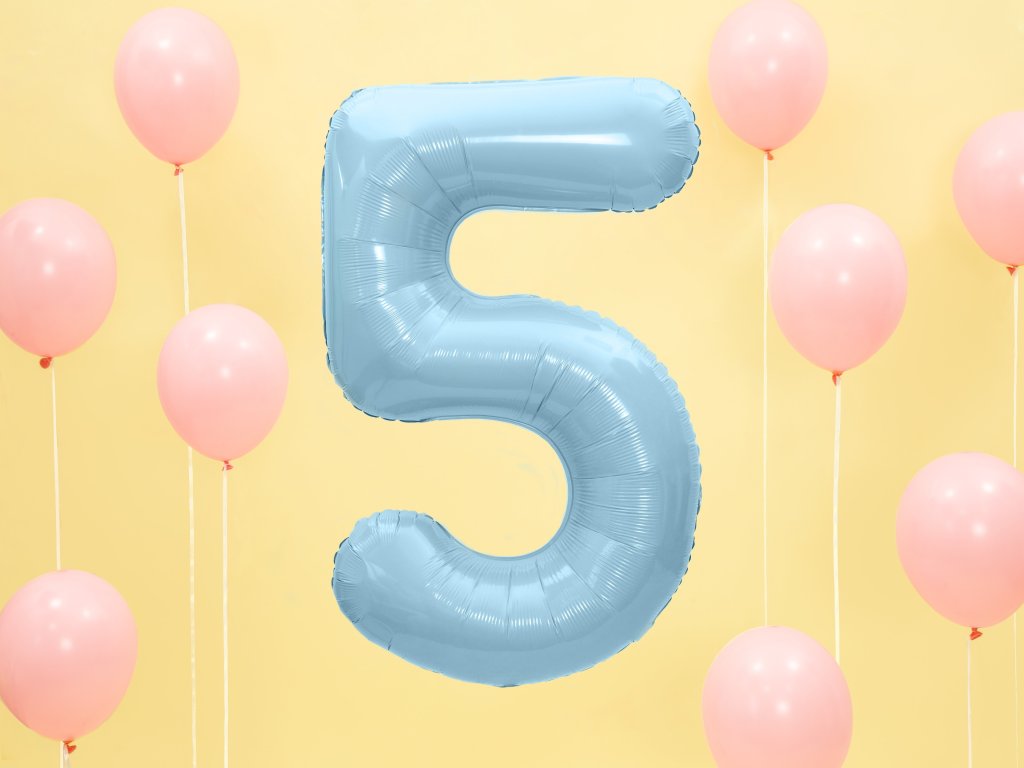 Balon z pastelowej folii numer ''5'', jasnoniebieski, rozmiar przed napompowaniem ok. 100 cm (39''), rozmiar po napompowaniu ok. 86 cm (34''). Napompuj helem lub powietrzem.