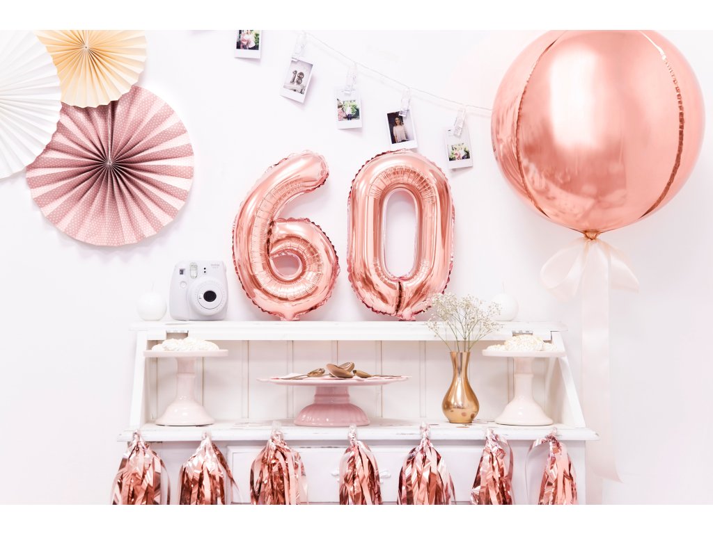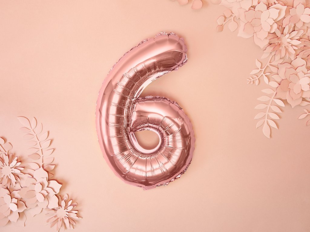 Metaliczny balon foliowy numer ''6'', różowo-złoty, rozmiar przed napompowaniem ok. 40 cm (16''), rozmiar po napompowaniu ok. 35 cm (14'').